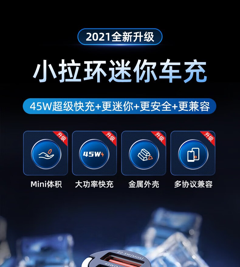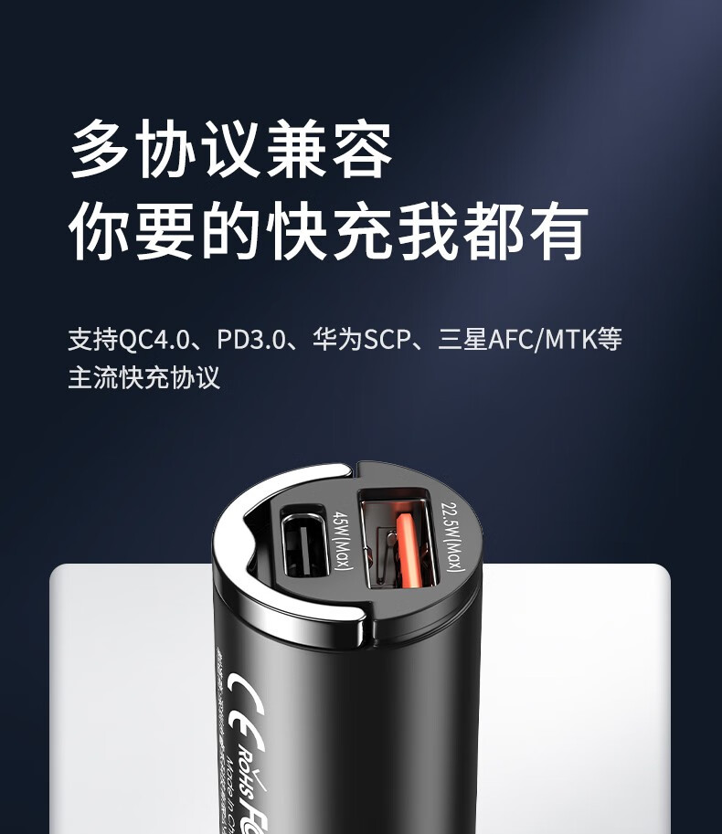 45W大功率快充,支持PD3.0、QC4.0、华为SCP/FCP、三星AFC等主流协议,兼容苹果、华为、小米、荣耀等多品牌设备