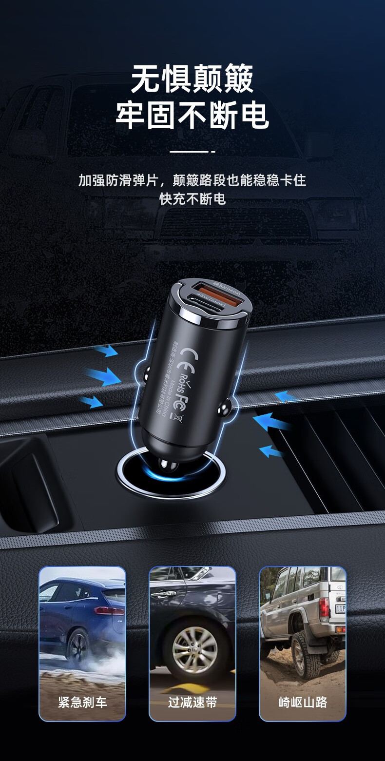小提手设计解决插拔困难问题,加强防滑弹片在颠簸路段也能稳固卡住,充电不断电