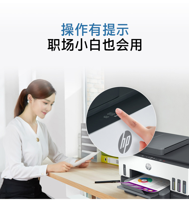 人性化细节:智能引导式氛围灯显示工作状态;触控面板操作便捷;封闭式进纸盒防潮防尘,内置纸张传感器提供低纸量提醒