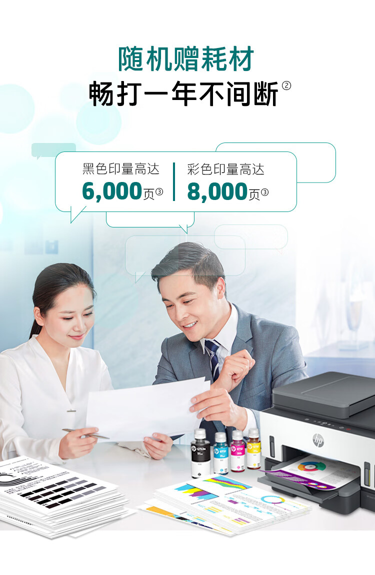 大印量墨仓设计:内置墨仓,黑色印量达6000页、彩色印量达8000页,减少耗材更换频率