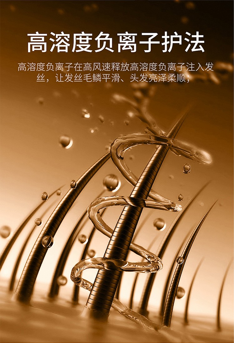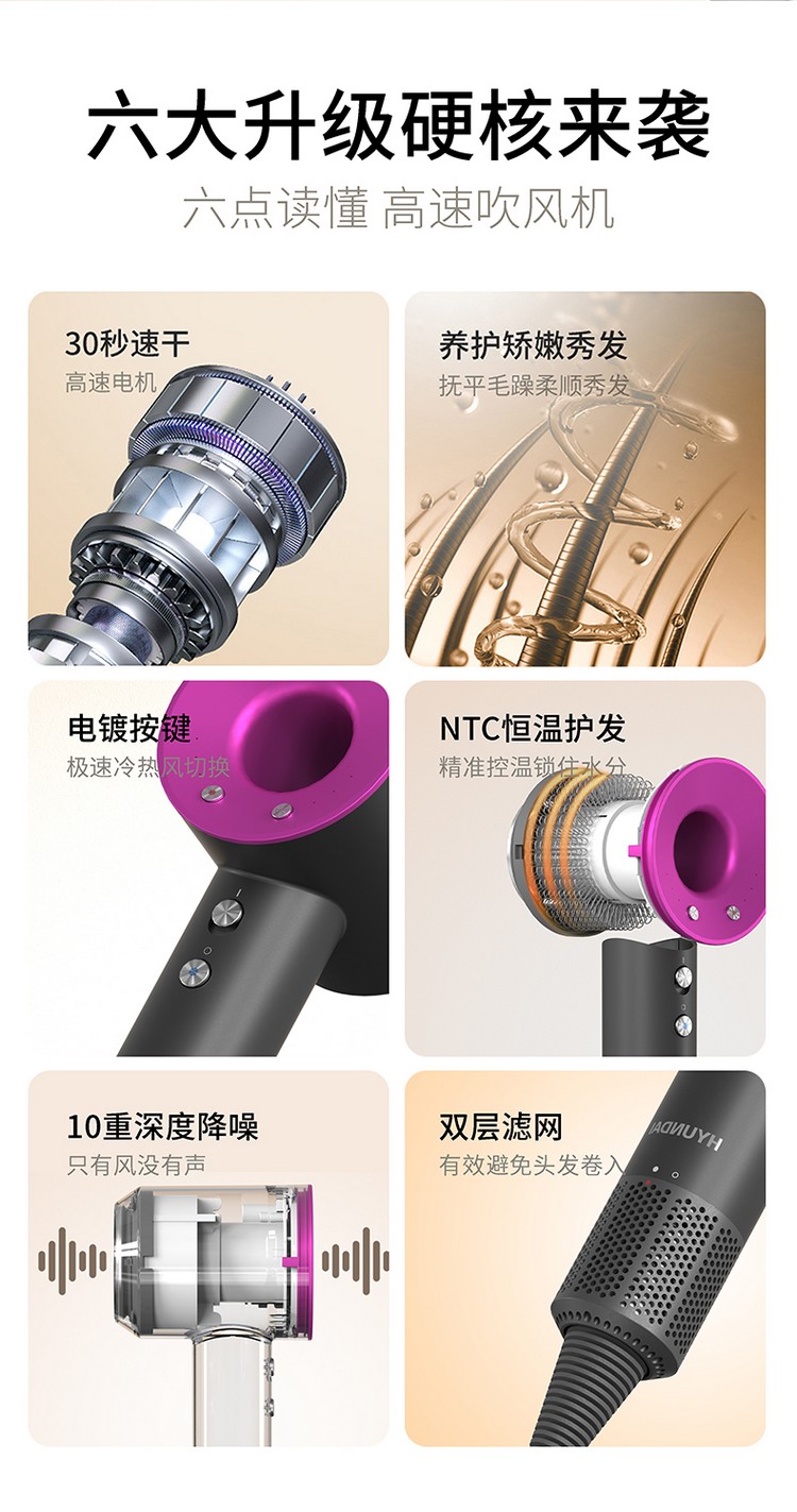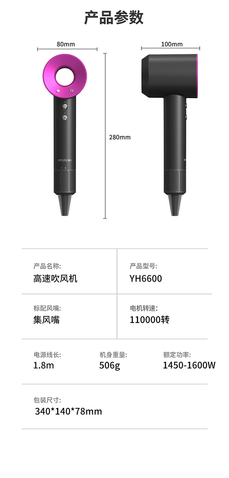 HYUNDAI YH6600高速吹风机采用110000转/分钟的高性能电机,实现高达99米/秒的狂飙风速,配合65米/秒的强劲气流,可在短时间内完成快速干发,短发约15秒、齐肩发约2分钟、长发约5分钟即可速干。产品搭载NTC智能恒温系统,精准控温,避免高温损伤头发,保护毛鳞片结构,防止头发干枯毛躁。内置高溶度负离子发生器,在高速风力下释放大量负离子,中和静电,抚平毛躁,使头发柔顺亮泽。机身采用轻量化设计,重量仅508g,比一杯中杯奶茶还轻,长时间使用不累手,适合日常频繁使用。配备磁吸式集风嘴,安装便捷,提升风力集中度,增强造型效果。双层滤网设计有效防止头发卷入,提升安全性。电镀按键具备防滑纹理,操作灵敏,冷热风切换迅速。整机采用ABS塑料与金属材质结合,外观质感细腻,耐用性高。电源线长度为1.8米,满足多种使用场景需求。