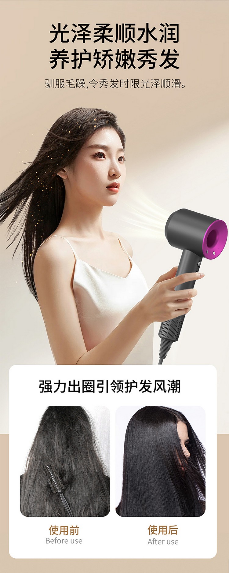 适用于家庭日常护发护理,特别适合追求高效干发体验的用户,尤其适合长发或湿发较多的人群。其快速干发功能可显著缩短洗漱时间,适合早晨赶时间的上班族、学生等快节奏生活人群。由于具备恒温护发和负离子技术,也适合发质脆弱、易毛躁的用户进行日常养护。同时,小巧轻便的设计使其便于携带,适合旅行、出差或酒店使用。此外,其造型功能可辅助完成日常发型打理,如吹直、蓬松或定型,是居家美发的理想工具。