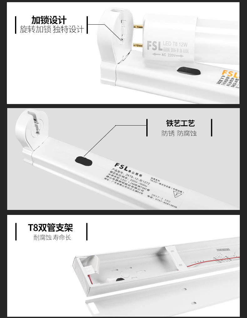 FSL佛山照明 LED单双灯管单双端供电0.6/0.9/1.2米家居工程T8支架 T8ZJ-8 T8双管带罩支架 1.2米