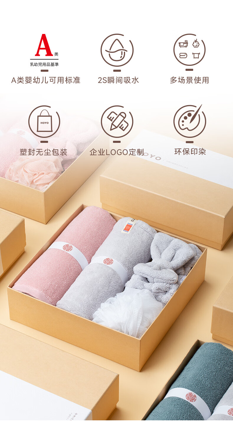 HOYO洗漱四件套7246采用高品质棉质面料,柔软亲肤,符合A类婴幼用品安全标准,适合敏感肌肤使用。产品具备2秒瞬间吸水性能,快速干燥,提升使用舒适度。套装包含两条毛巾、一条浴帽和一个沐浴球,满足日常洗漱的多种需求。包装采用无尘车间塑封工艺,有效防受潮、防氧化、防挤压、防吸味、防日晒、防手触,确保产品在运输和储存过程中保持洁净与完好。环保印染技术,不添加有害化学物质,健康安全。支持企业LOGO定制,适用于礼品赠送或品牌宣传。