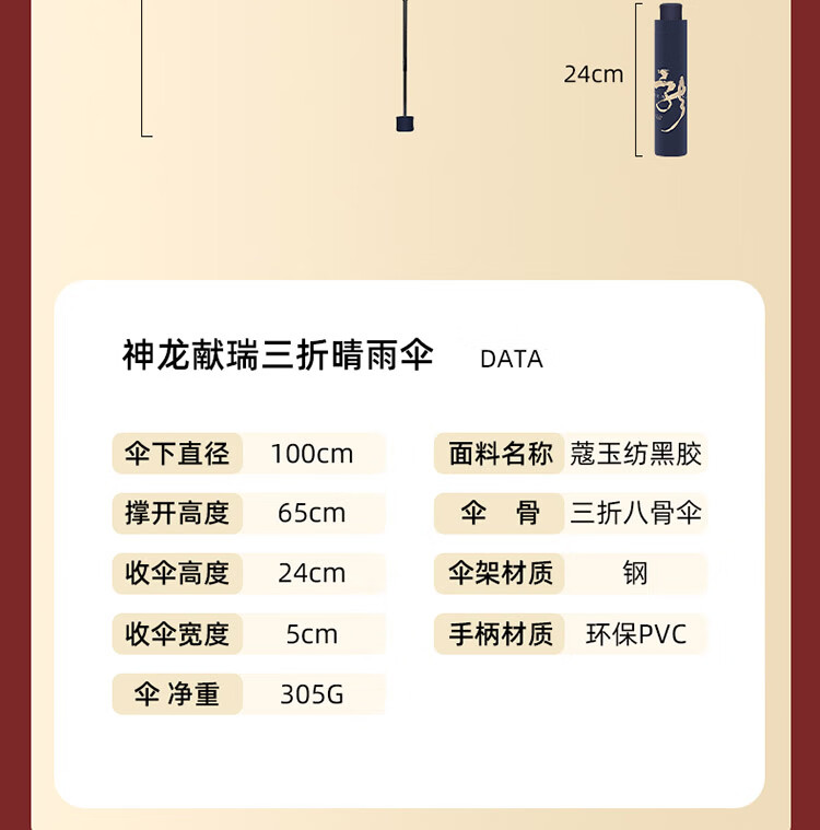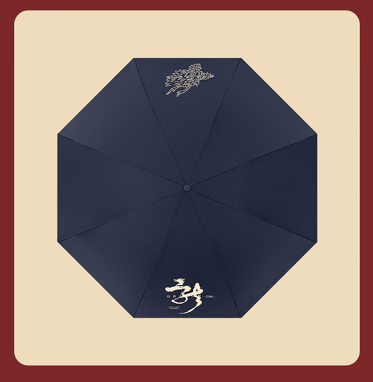 伞面印有‘神龙献瑞’主题图案,融合传统龙纹元素与现代书法艺术,彰显东方美学气质,兼具文化内涵与时尚感。