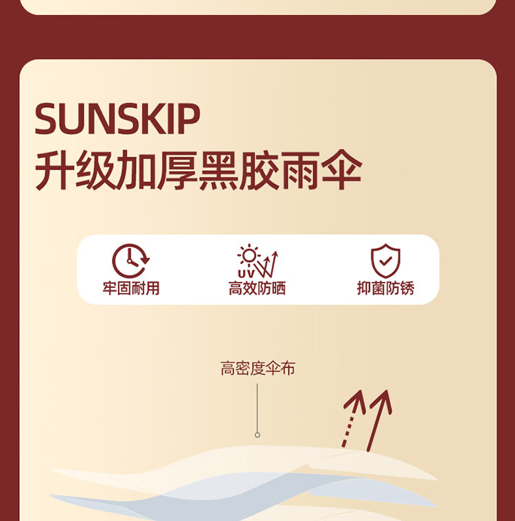 本款天堂伞33919E神龙献瑞三折晴雨伞采用寇玉纺黑胶面料,具备高效防晒与防水双重功能。伞布内层加厚黑胶涂层,UPF50+标准,可有效阻隔99.9%紫外线,全面防护UVA/B,适合长时间户外使用。
