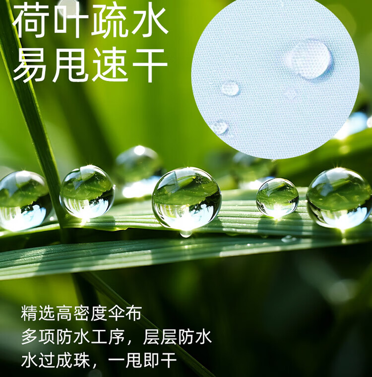 伞面选用高密度伞布,经过多项防水工艺处理,具有荷叶疏水效果,雨水接触后成珠滚落,一甩即干,保持伞面洁净。