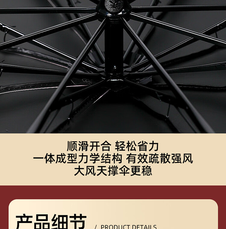 伞骨采用三折八骨钢制结构,坚固耐用,防锈抗压,可承受约11m/s风力(6级强风),在大风天气下依然稳定不翻转。
