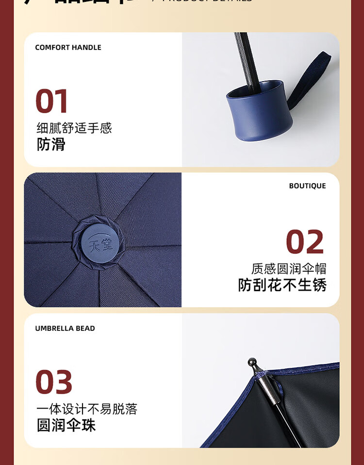 手柄采用环保PVC材质,细腻防滑,握感舒适;伞帽圆润质感,防刮花不生锈;伞珠一体成型,不易脱落,细节做工精致。