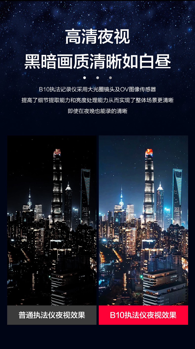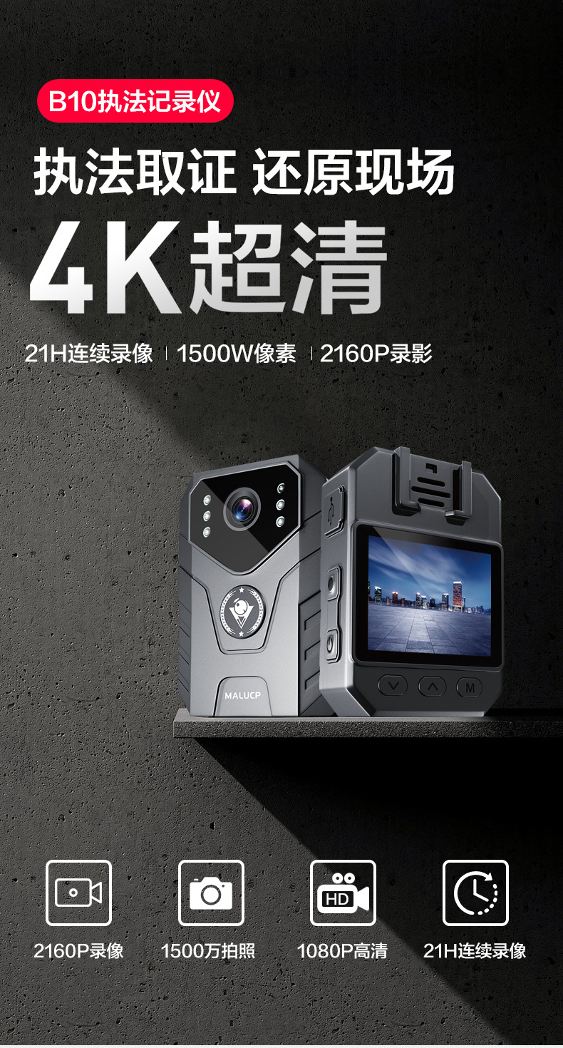 马路诚品B10执法记录仪采用4K超高清(2160P)分辨率,搭配1500万像素传感器,确保画面细节清晰可见。搭载大光圈镜头与OV图像传感器,结合背照式像素技术,显著提升感光灵敏度,实现真·4K高清夜视效果,即使在低光环境下也能还原如白昼般的画质。