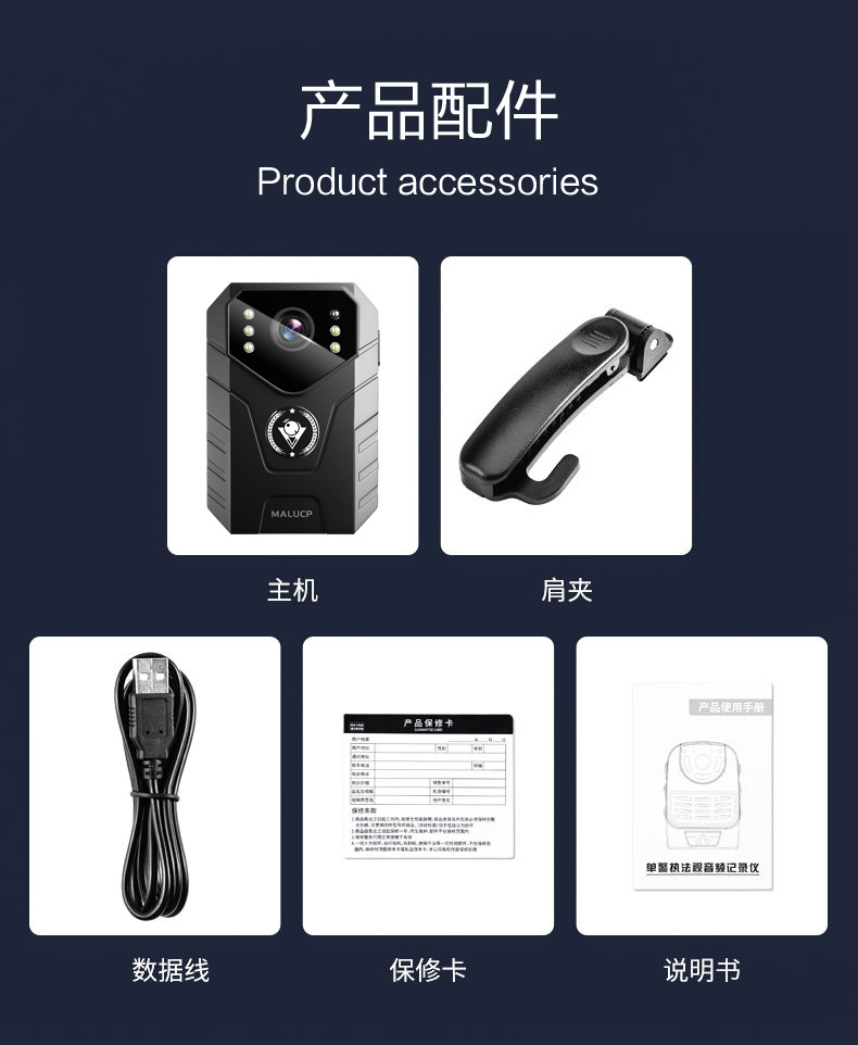 主机尺寸为80mm×57mm×28mm,轻巧便携,兼容多种佩戴方式,支持肩夹固定。支持16GB至128GB高速存储卡扩展,视频格式为AVI,照片格式为JPG,工作温度范围-20℃~65℃,适应极端气候条件。