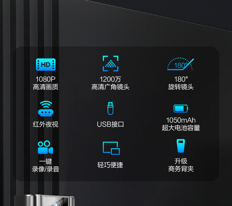 机身尺寸仅为85mm×26mm×14mm,重量仅26g,轻巧便携,单手即可握持,配备升级商务背夹,方便固定于衣物或装备上。