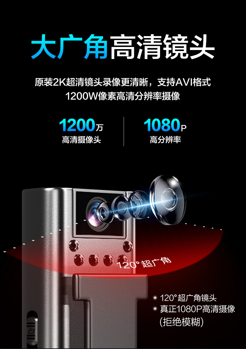 配备1200万像素大广角镜头,具备120°超广角视野,可捕捉更宽范围的现场画面,适合复杂环境下的执法与记录需求。
