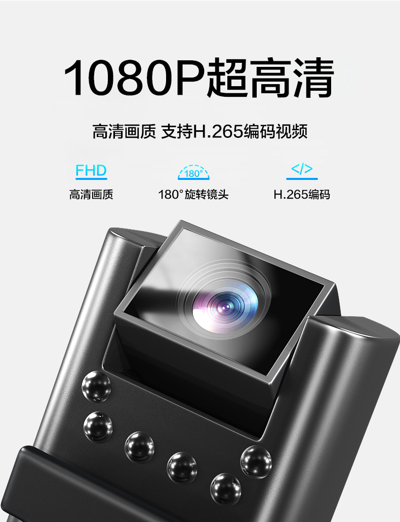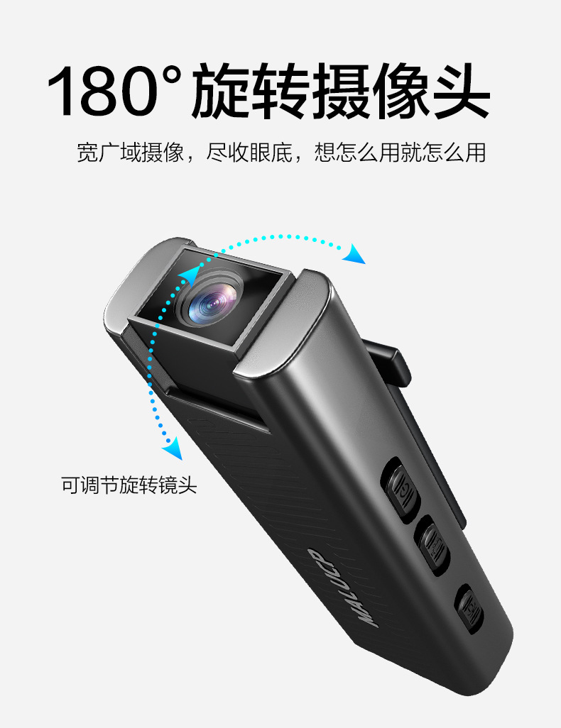 镜头支持180°旋转调节,可根据实际使用场景灵活调整拍摄角度,实现多方位取景,满足不同佩戴方式和视角需求。
