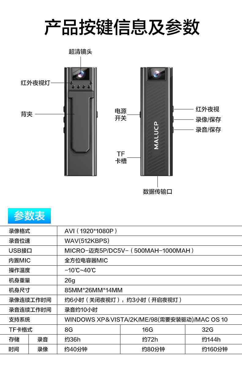 支持TF卡扩展存储,最大兼容32GB卡,本款为64G版本,提供充足空间用于长时间录影和音频保存。
