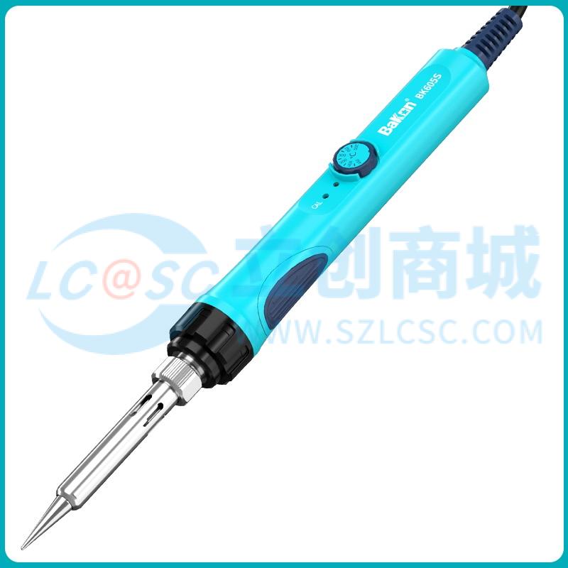 品牌为Bakon(深圳白光),型号BK605S,具备以下特点:- 功率与加热:功率60W,内热式加热,升温快速,可满足日常焊接温度需求。- 控温调节:旋钮调温,温度范围200 - 450℃,恒温控制,温度稳定度±2℃,焊接温度精准,适配不同焊接场景。- 烙铁头与套管:环保无铅烙铁头,搭配耐造不锈钢套管,不生锈、抗腐蚀、耐用性强,导热快,解决上锡难题。- 机身设计:尼龙机身,人体工学设计,握持舒适;前后端电木隔离,有效隔离前端热量,避免烫伤,使用安全。- 电源线:3C认证电源线,采用0.5mm²无氧铜丝,偏心率低、线皮薄厚均匀,全新料PVC制作,抗拉耐折(通过5公斤砝码45°弯折8000次摇摆试验),耐热阻燃,可轻松承载大功率,用电安全有保障。- 发热芯:采用BK1370焊接式发热芯,加热补温效率快,使用寿命长。- 便携性:小巧便携,出门工作携带方便,可实现“走到哪,焊到哪”。