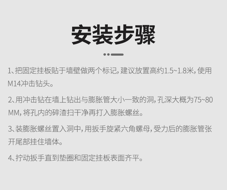 安装高度建议为1.5~1.8米,便于操作且不影响日常通行,使用M14冲击钻头钻孔深度约75~80mm,并正确安装膨胀螺丝以确保承重能力。