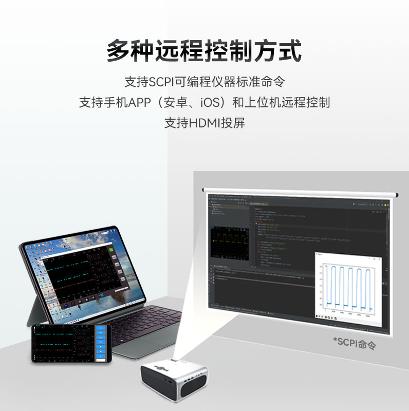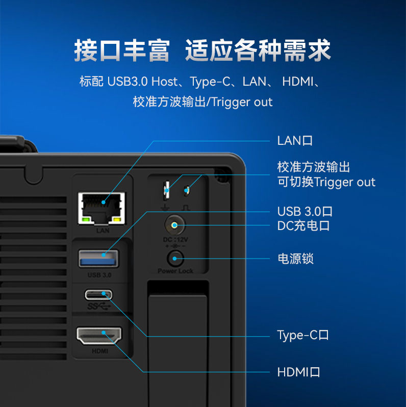 5 接口与扩展:配备USB3.0 Host、USB Type-C、LAN、HDMI接口,支持校准方波输出/Trigger out;可通过手机APP(安卓/iOS)、上位机远程控制,支持HDMI投屏