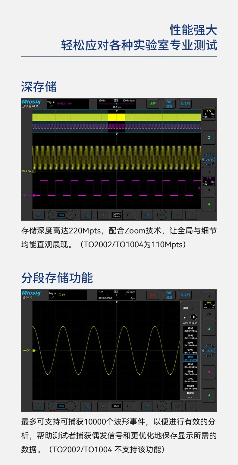 3 硬件性能:最大存储深度110Mpts,波形捕获率7.8万次/秒,垂直刻度1mV/div~10V/div,支持带宽限制