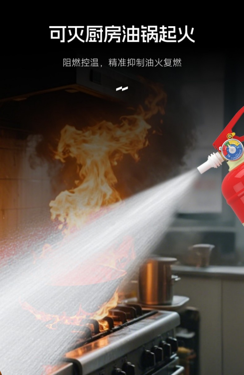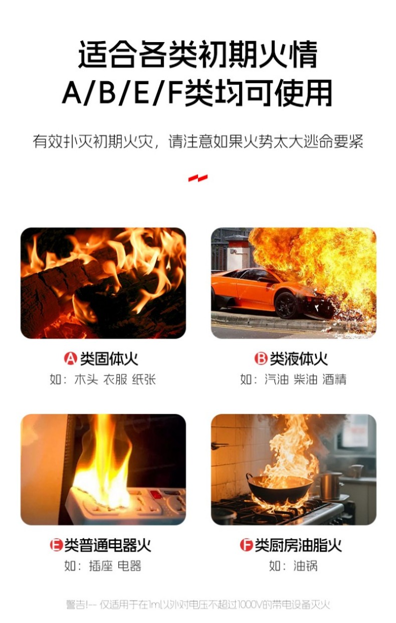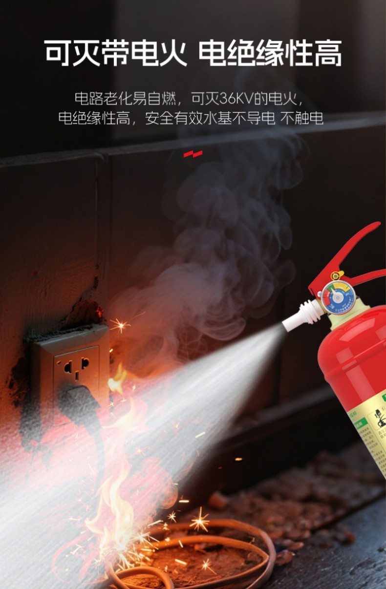电绝缘性高,可灭36KV以下带电火灾,适用A类固体火、B类液体火、E类电器火、F类厨房油脂火等多种初期火情