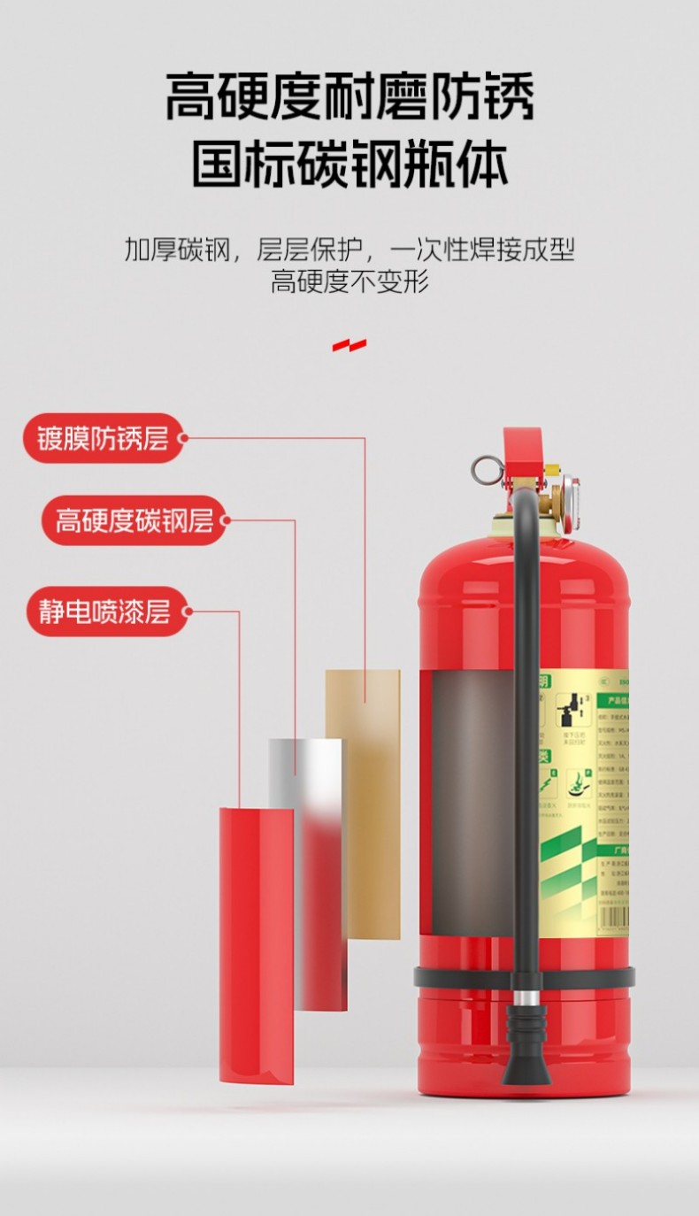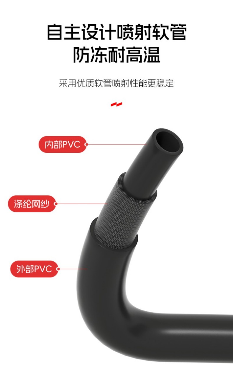 国标加厚碳钢瓶体,静电喷涂+镀膜防锈层,耐用不易变形;自主设计喷射软管,内部PVC+涤纶网纱+外部PVC结构,防冻耐高温