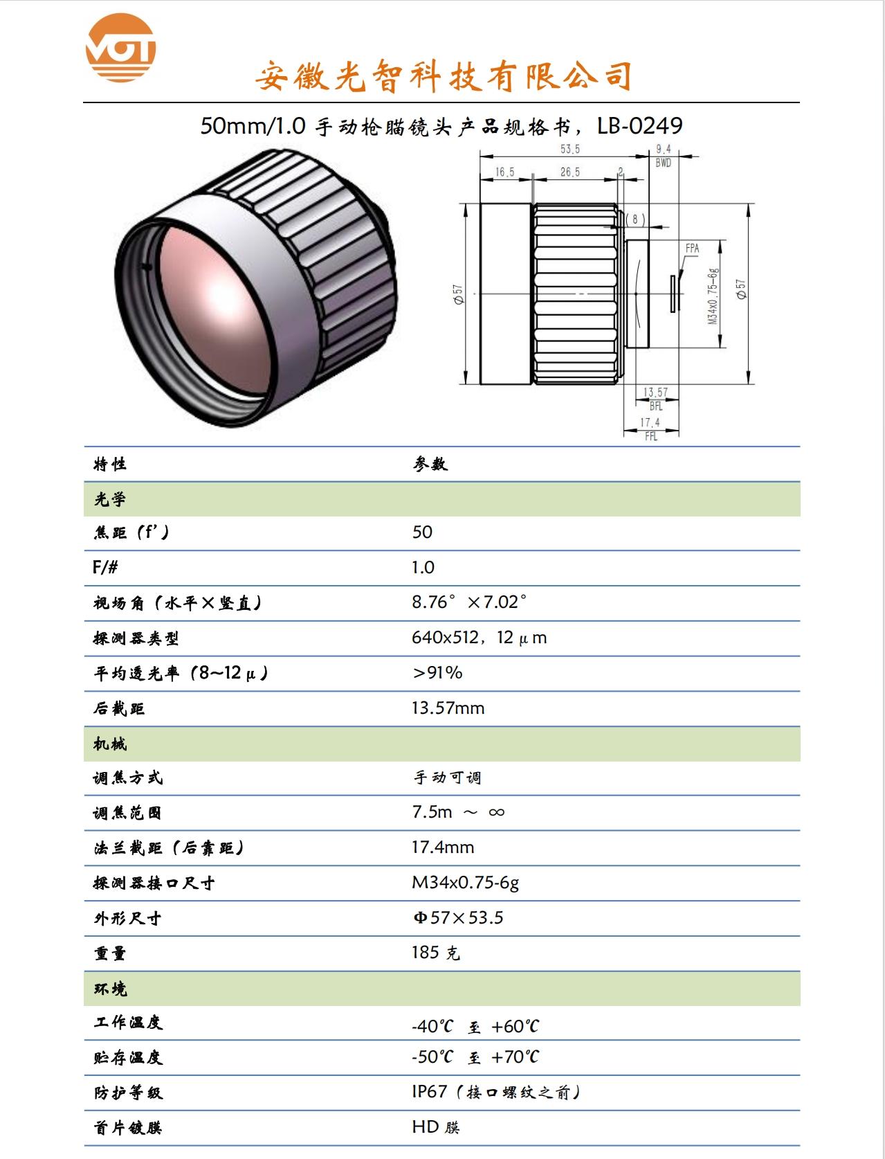 该镜头为VOT光智品牌LB-0249型号,专为红外热像仪设计的50mm焦距手动调焦镜头,采用高性能硫系玻璃材料制成,具备优异的红外光透过性能