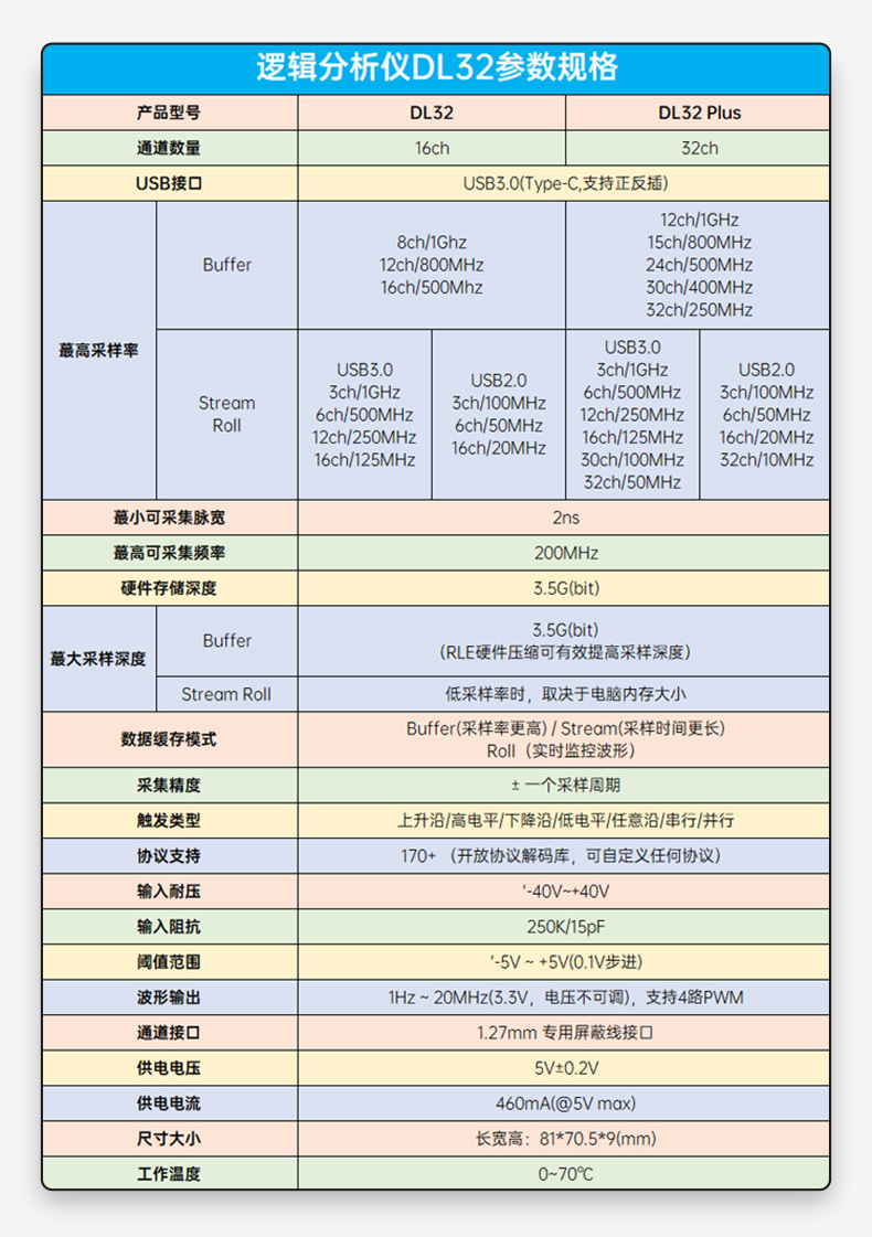 配备3.5Gbit硬件存储深度,结合RLE压缩算法,有效提升实际采样深度,支持长时间连续采样
