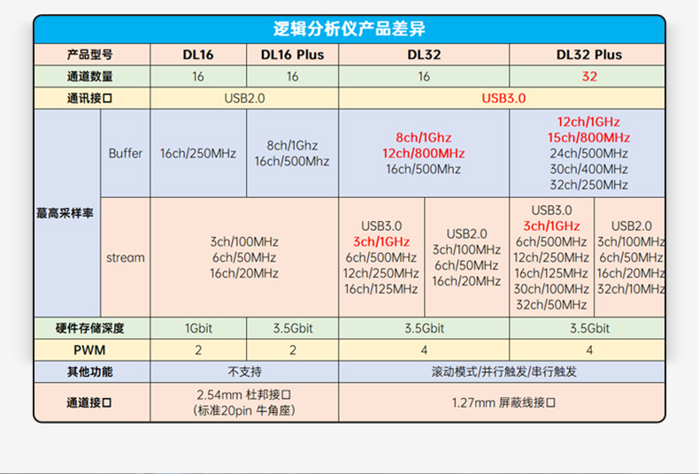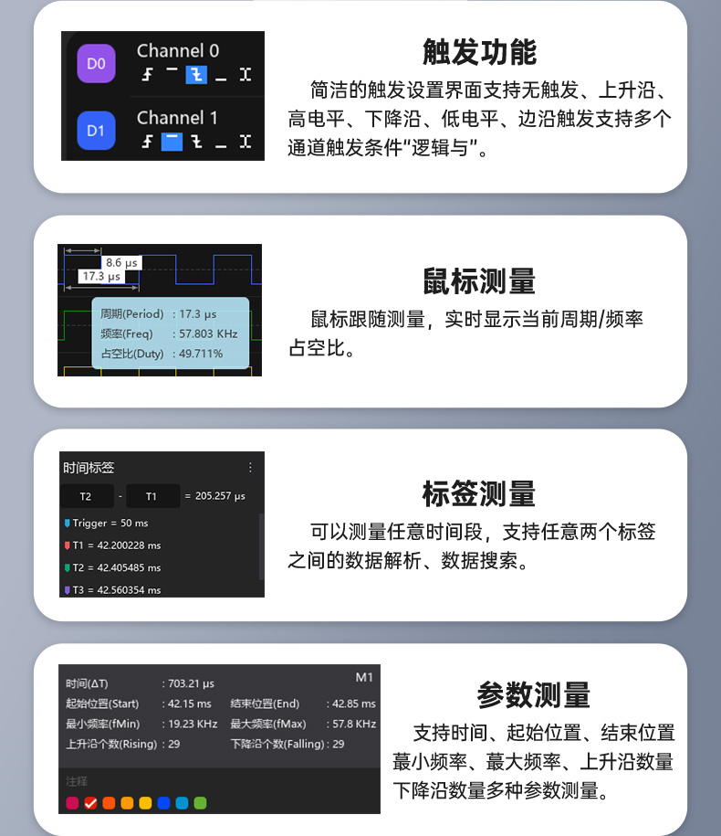 支持最高1GHz采样率(12通道),满足高速数字信号测试需求,尤其适用于高速接口如USB、HDMI等场景