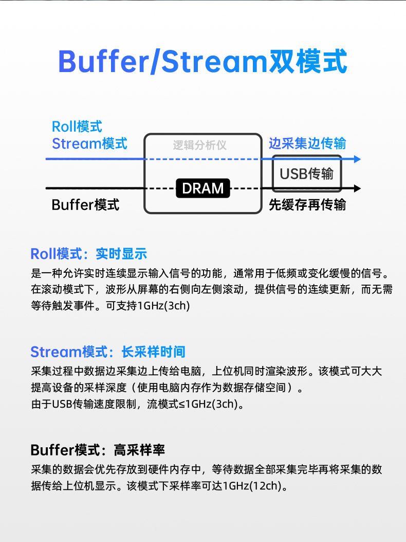 提供Buffer/Stream/Roll三种工作模式:Buffer模式实现高采样率捕获,Stream模式支持长时采样并利用电脑内存扩展存储,Roll模式实现实时波形滚动显示