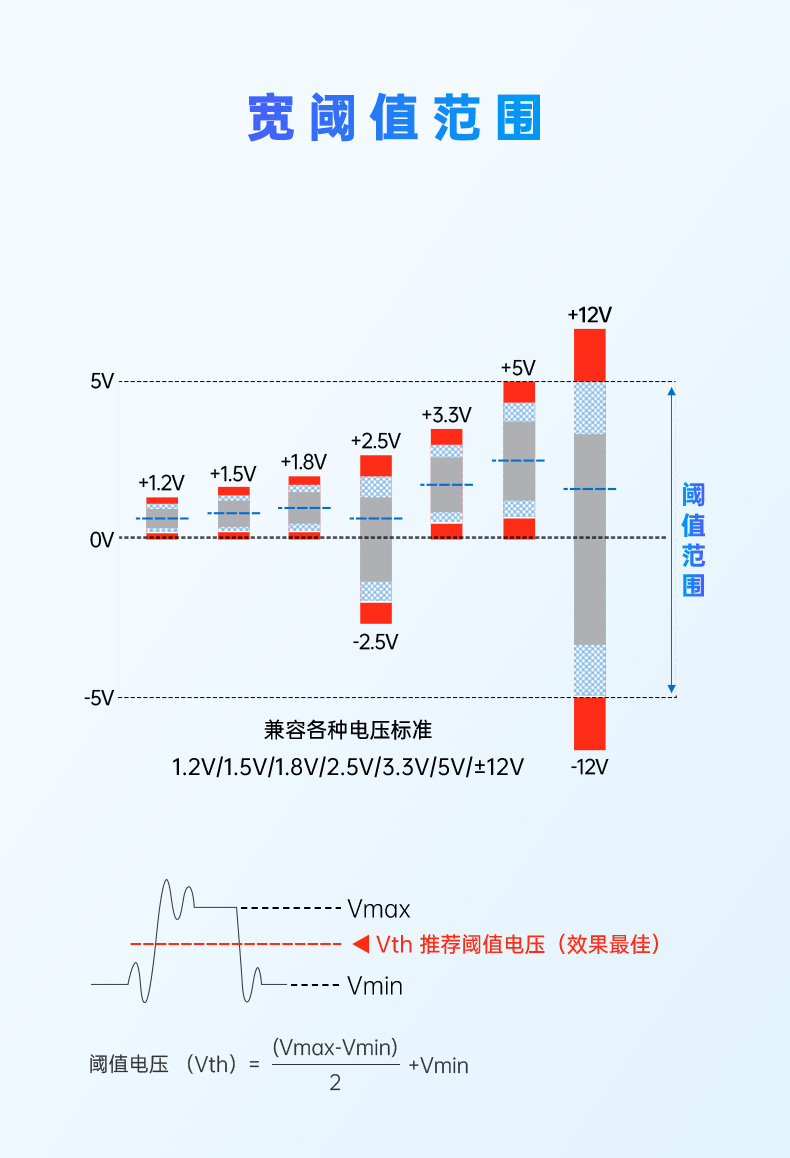 兼容多种电压标准(1.2V/1.5V/1.8V/2.5V/3.3V/5V/±12V),宽阈值范围适应不同电平系统,内置自动阈值推荐功能
