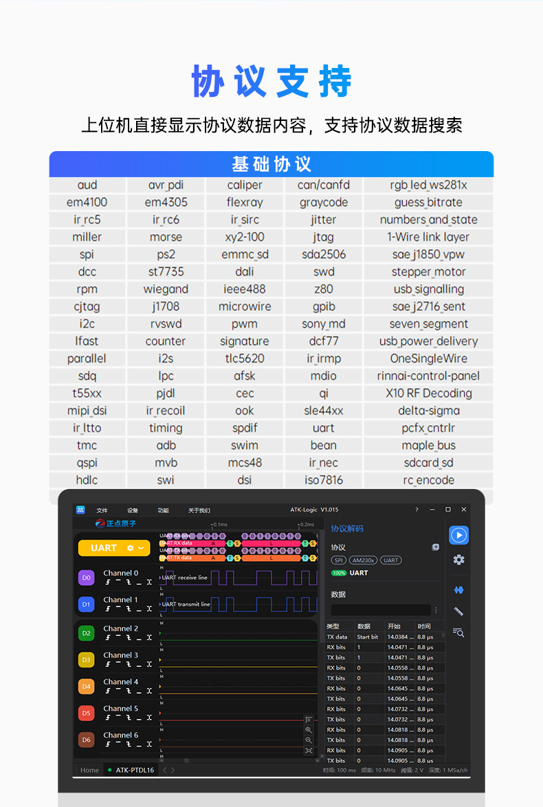 11 内置170+种协议解码功能,涵盖基础协议(如UART、SPI、I2C、CAN等)和上层协议(如USB、HDMI、Bluetooth等),支持自定义协议开发
