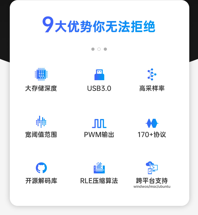 3 最高采样率达1GHz(12通道),支持15ch/800MHz、32ch/250MHz采样率,确保高速信号精准还原