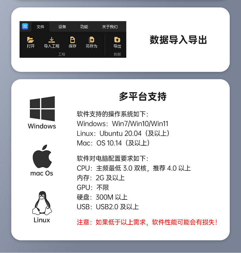 1 使用前请确认电脑操作系统版本符合要求(Windows 7/10/11、Ubuntu 20.04及以上、macOS 10.14及以上)
