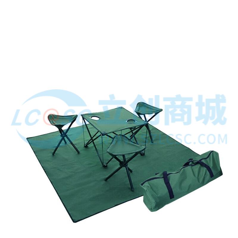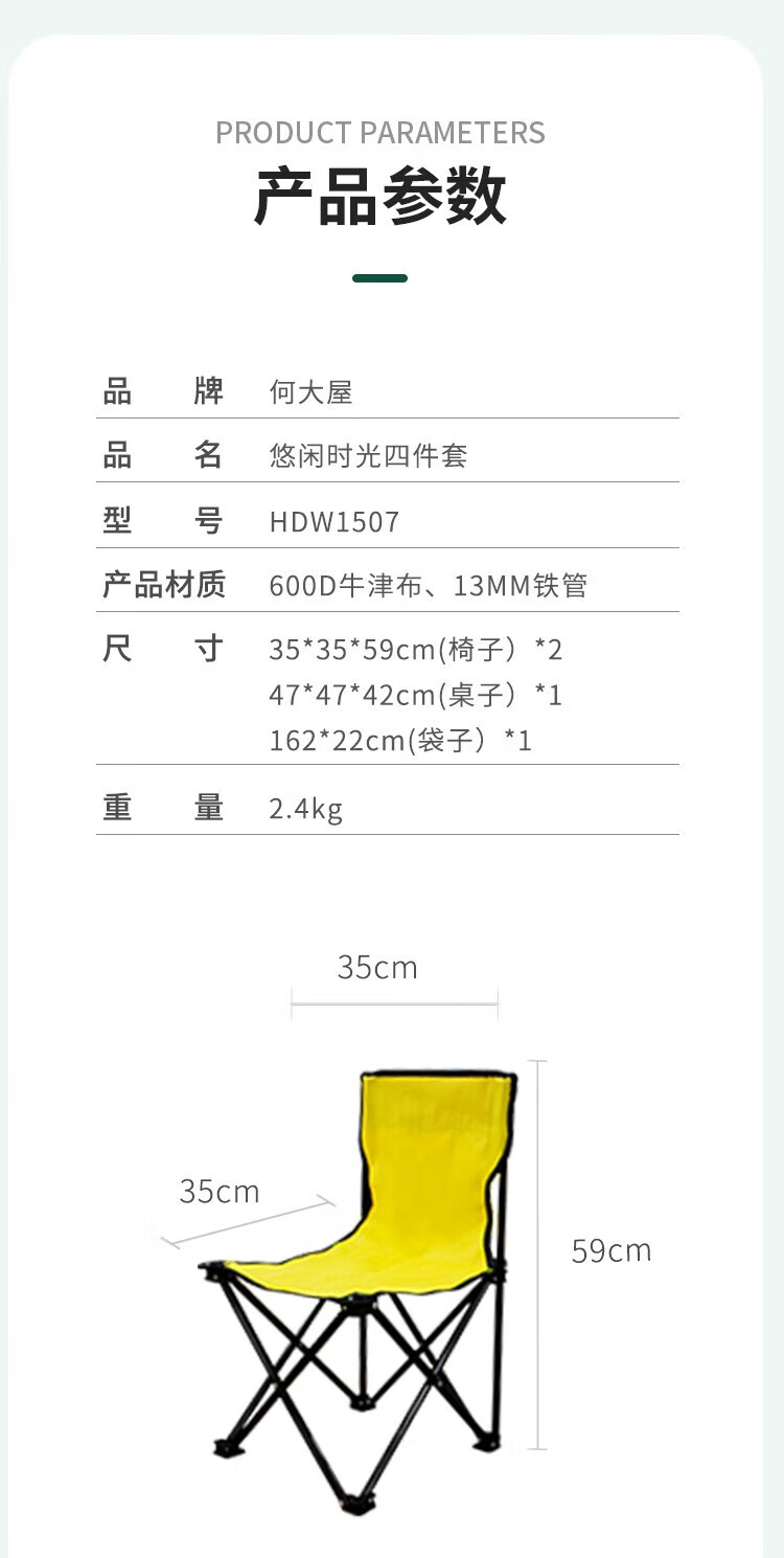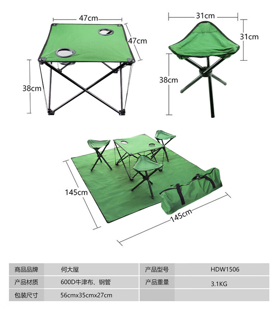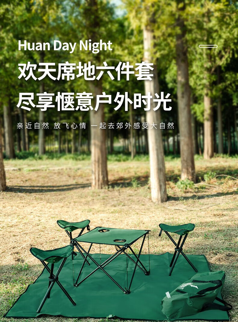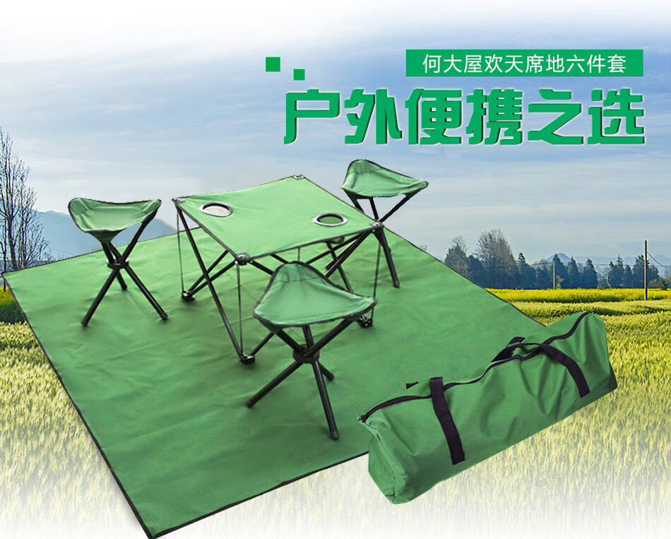 何大屋欢天席地六件套(型号HDW1506)包含一张折叠桌、三把折叠椅、一块野餐垫和一个便携收纳包,组成完整的户外休闲套装