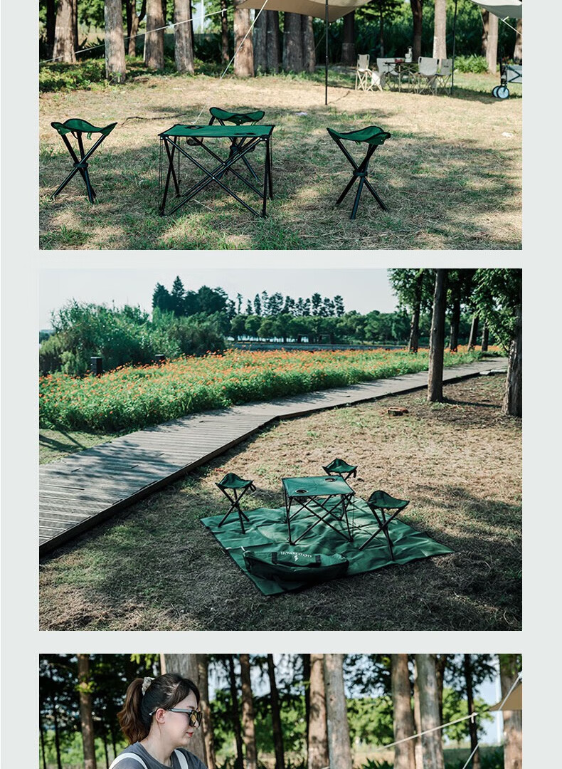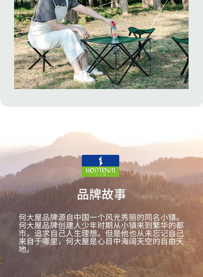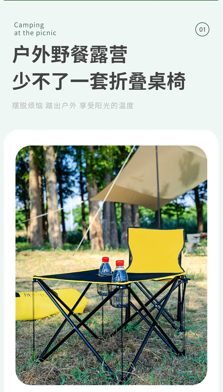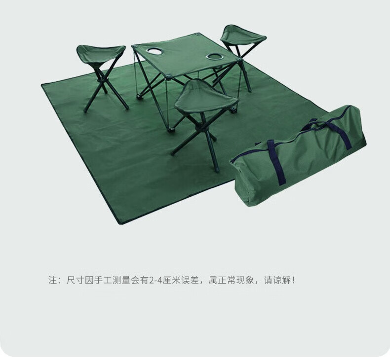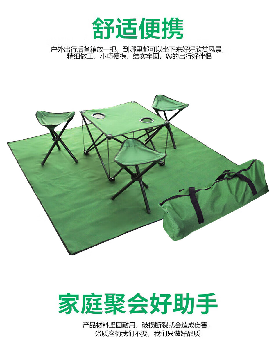 何大屋欢天席地六件套(型号HDW1506)包含一张折叠桌、三把折叠椅、一块野餐垫和一个便携收纳包,组成完整的户外休闲套装