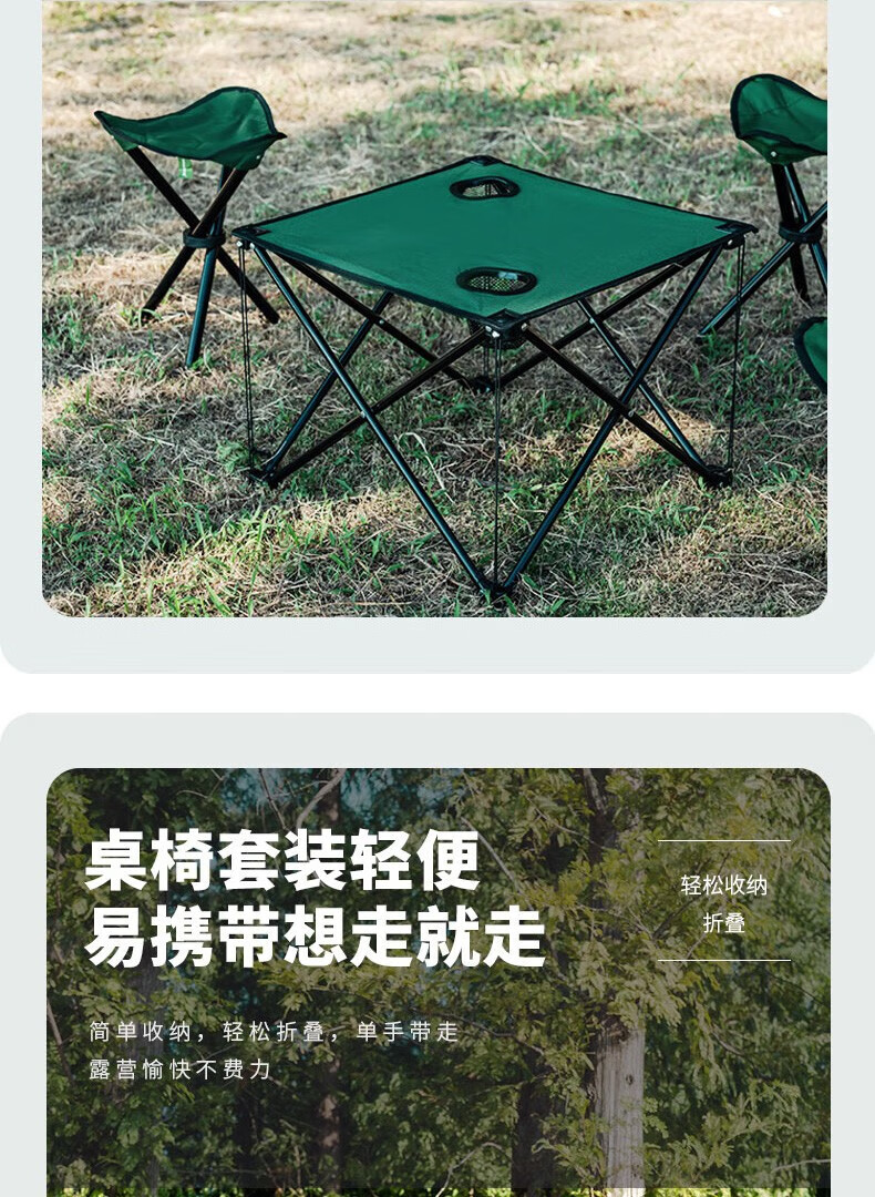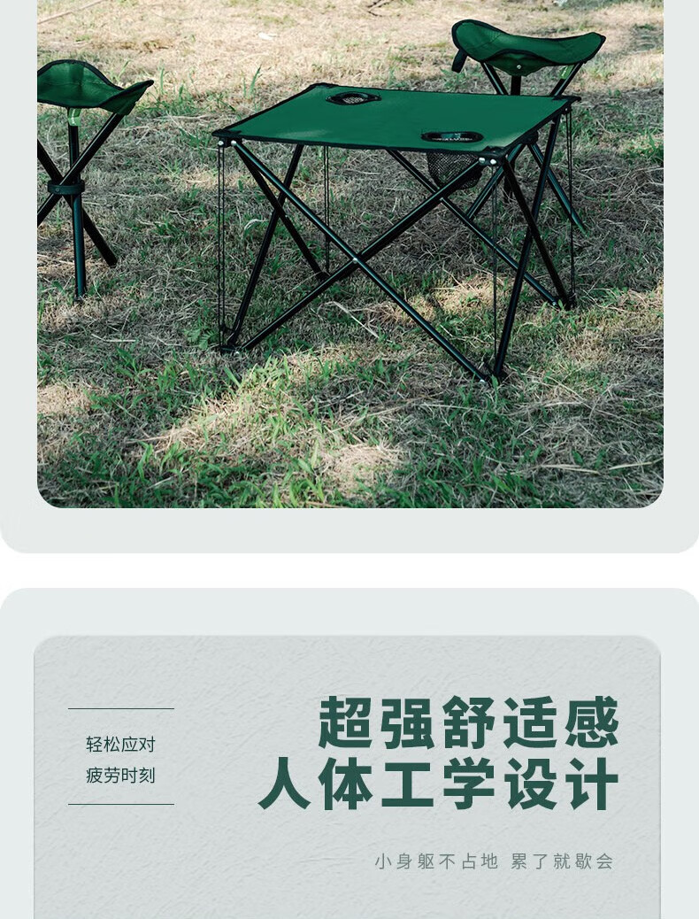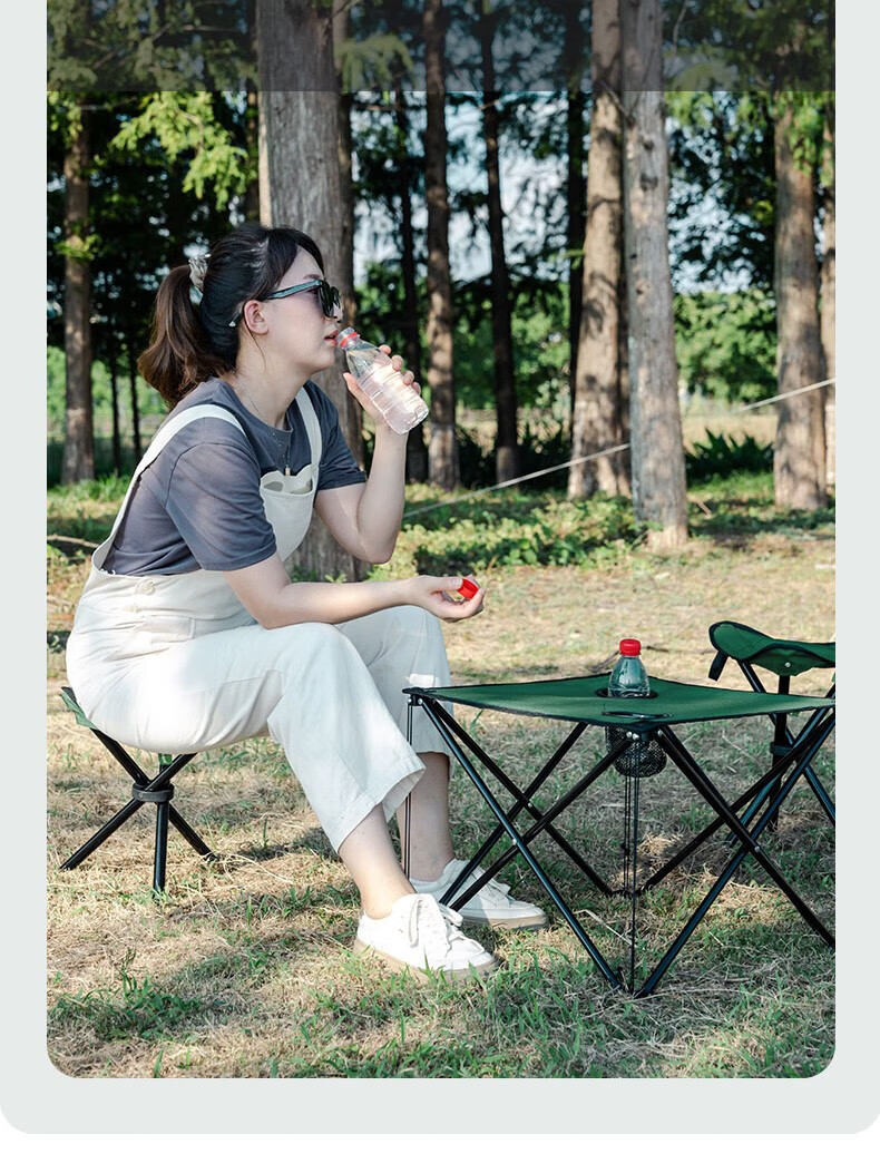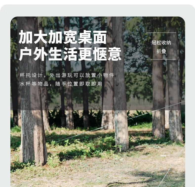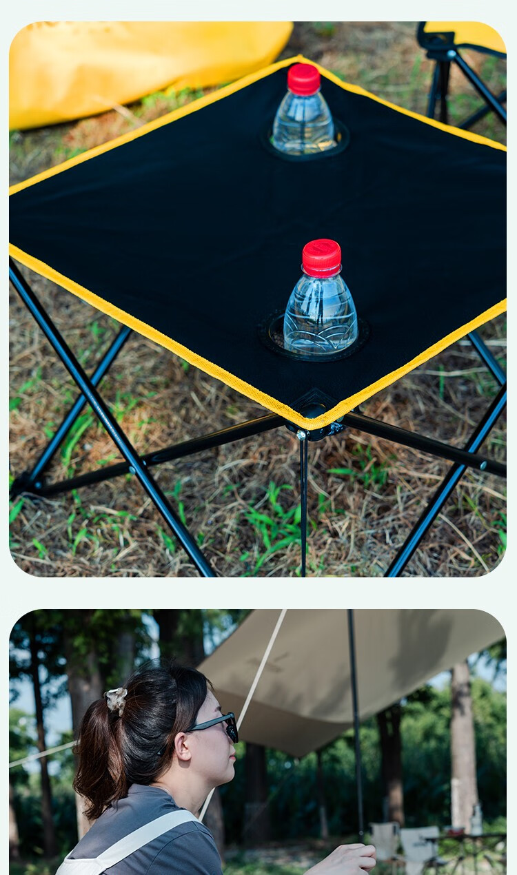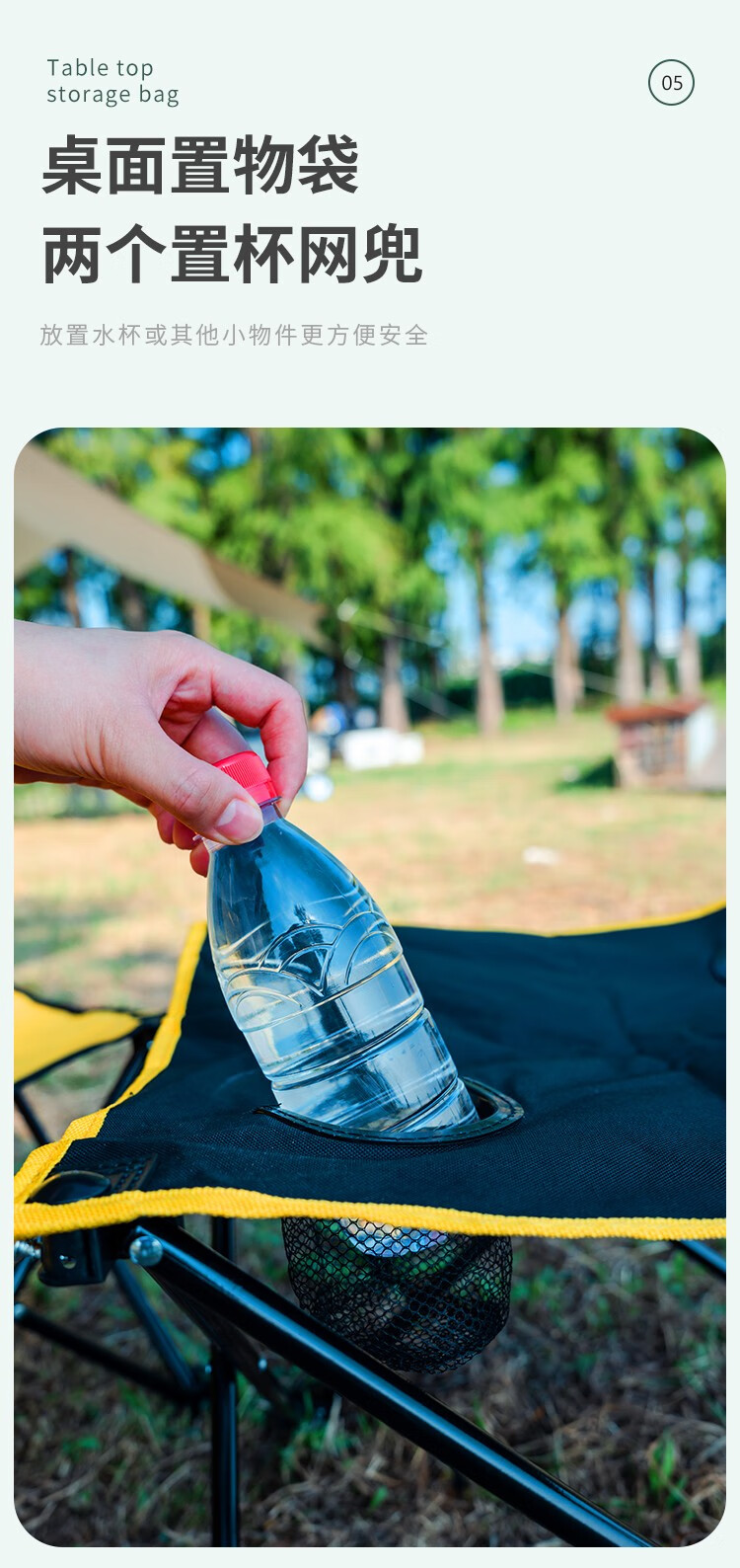 折叠桌桌面配备两个杯托网兜,方便放置水瓶或小物件,提升使用便利性