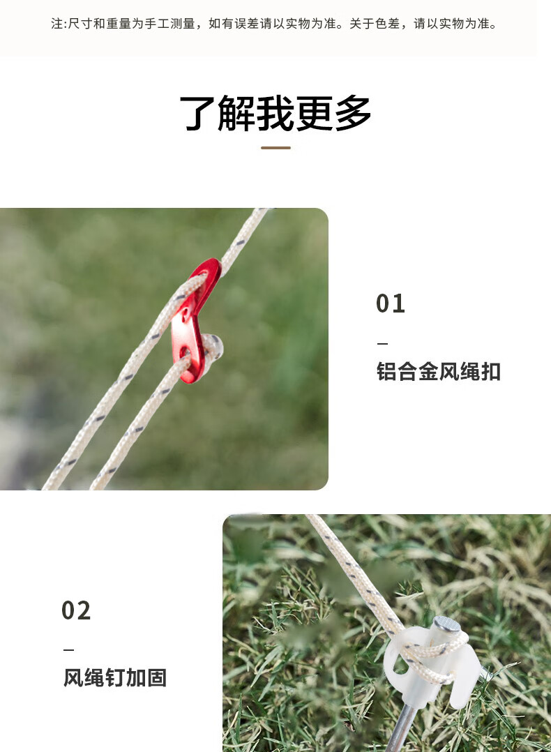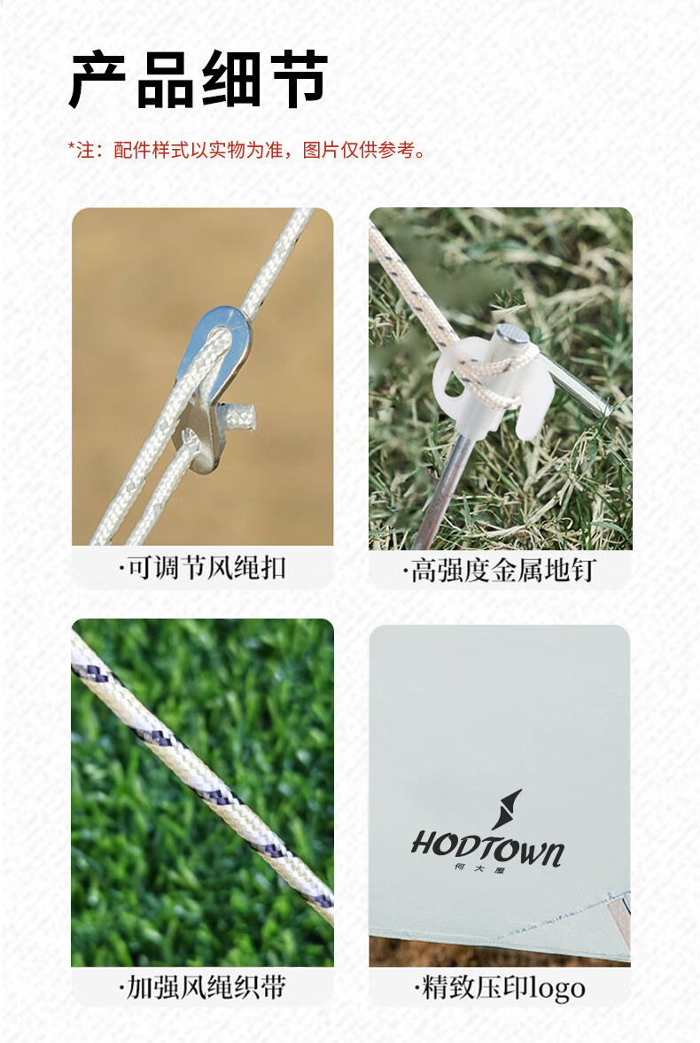 5 搭配高强度金属地钉和可调节风绳扣,实现快速固定与调整,提升整体安全性与耐用性