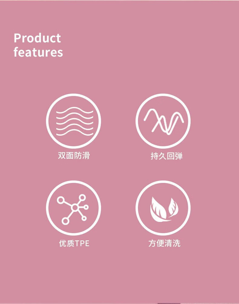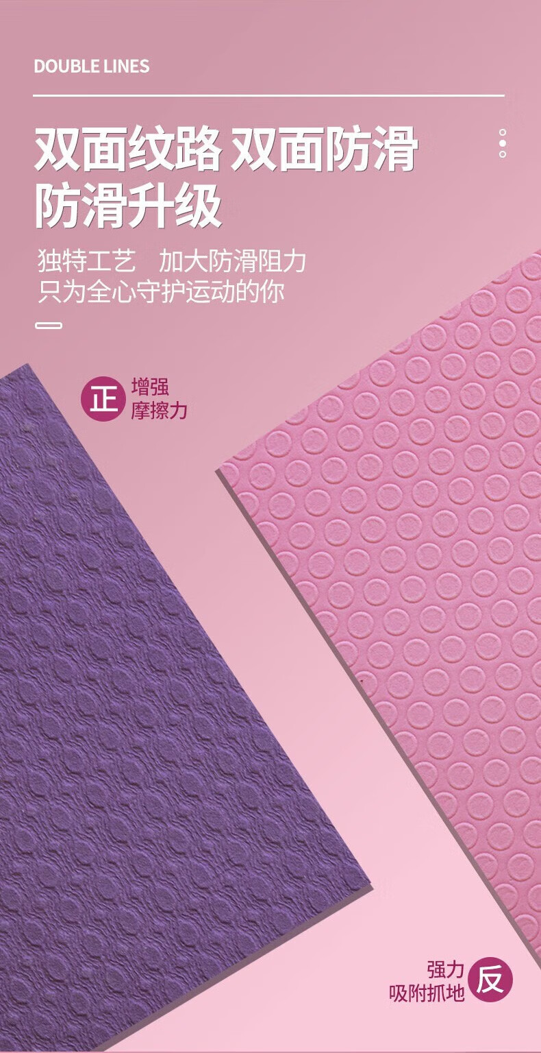 双面防滑设计,正面为增强摩擦力的纹理结构,反面为强力吸附抓地纹路,有效防止运动中打滑