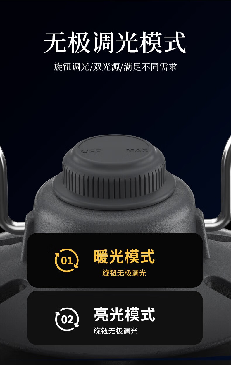 配备无极旋钮调光功能,支持暖光和亮光两种模式,满足不同照明需求