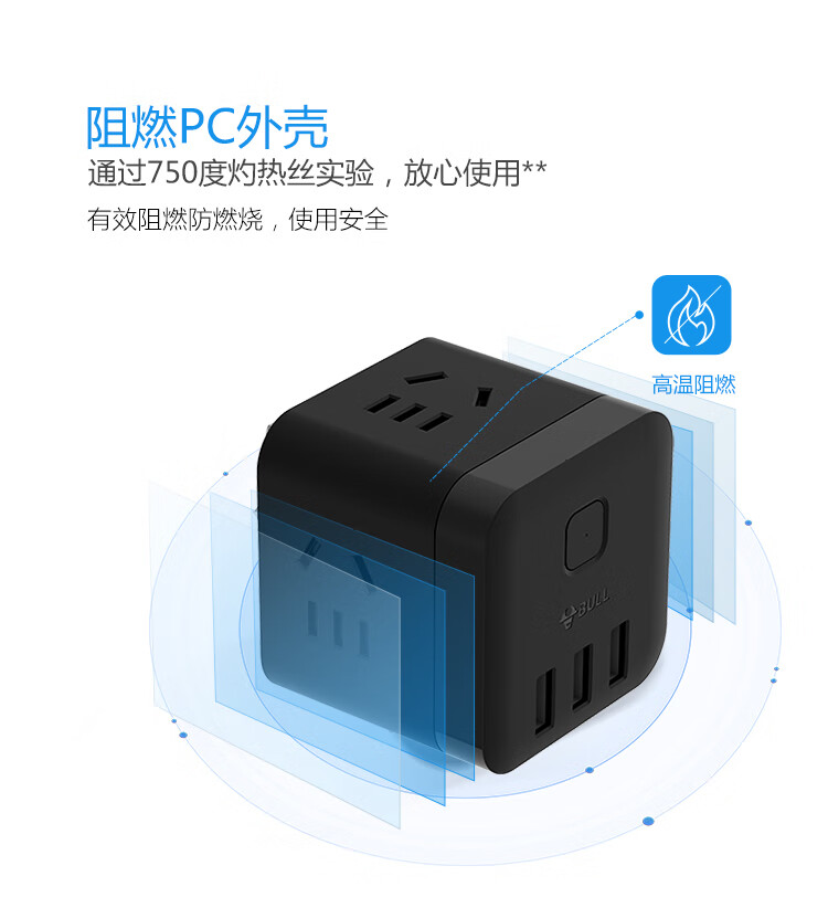 采用阻燃PC外壳,通过750℃灼热丝实验,具备优异的耐高温和防火性能,保障用电安全