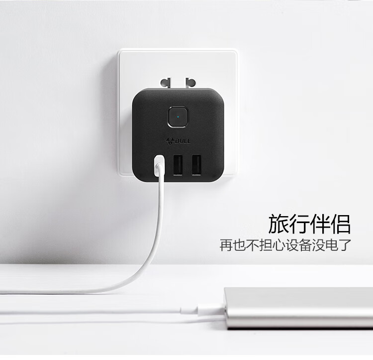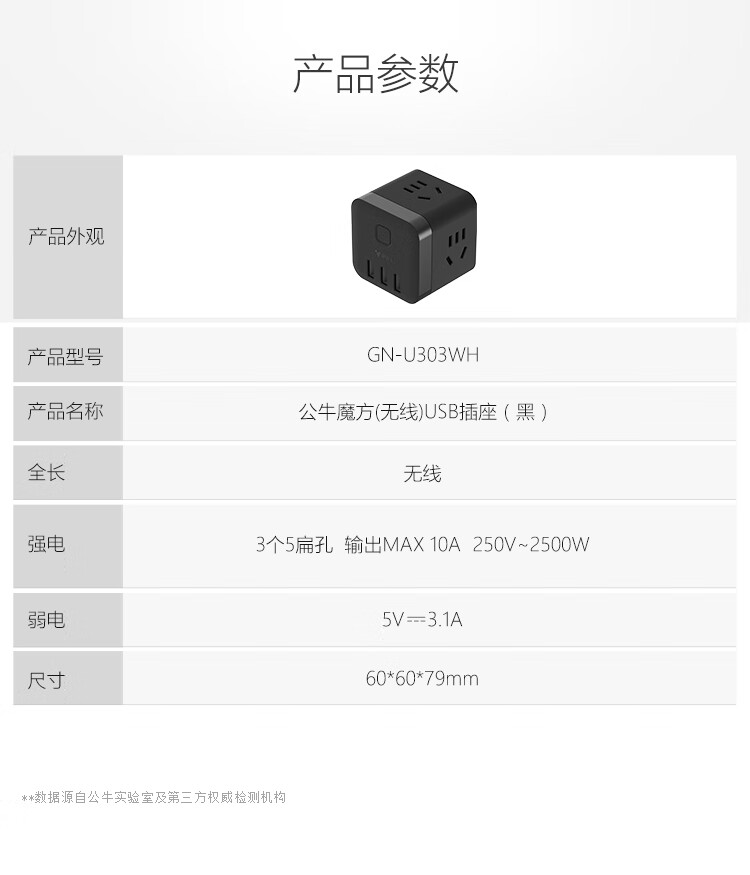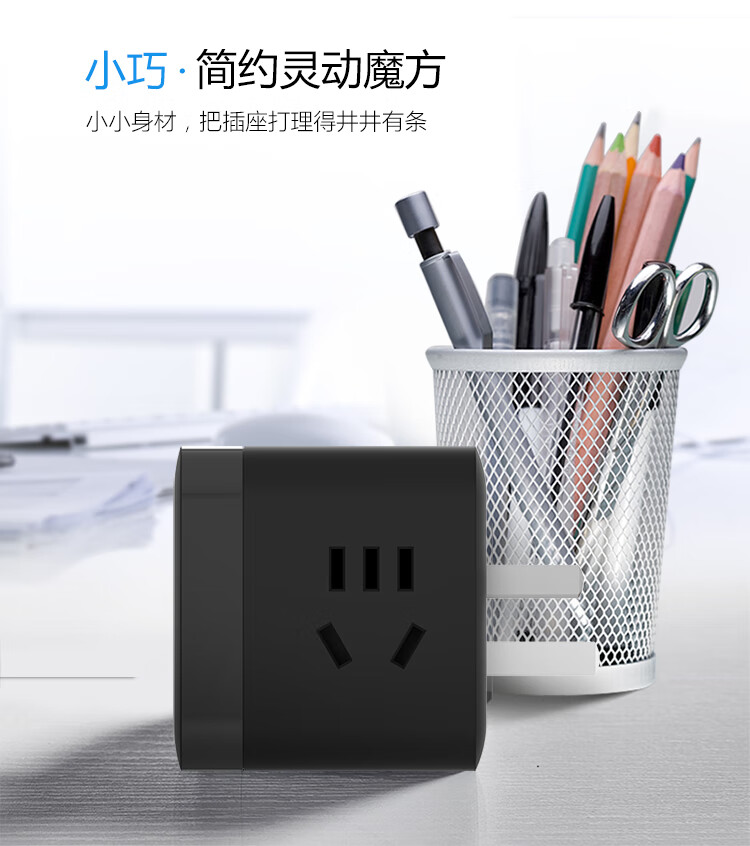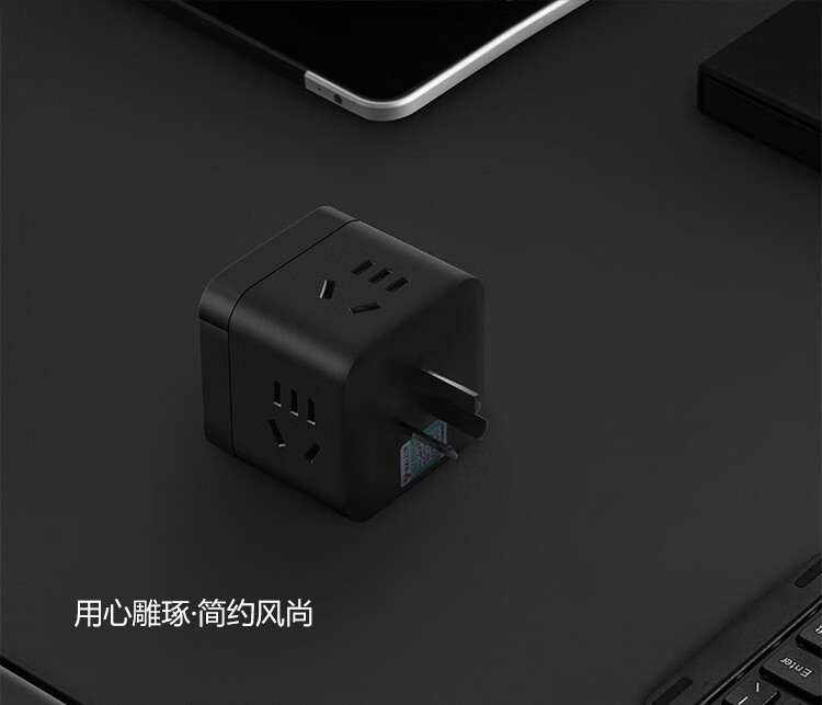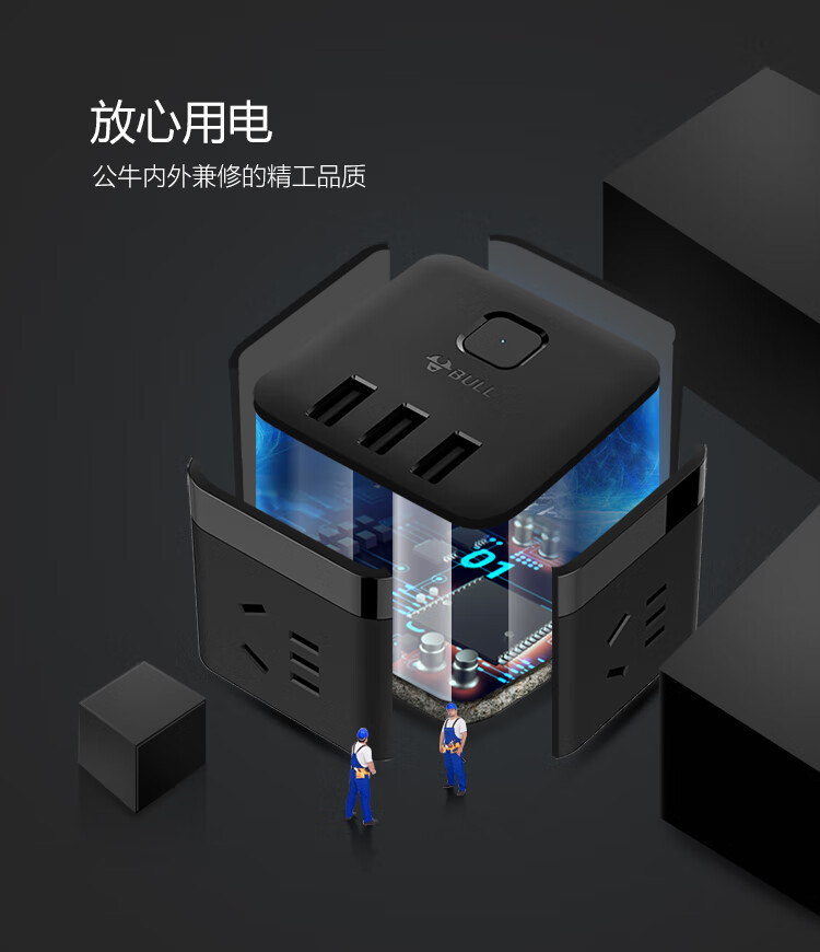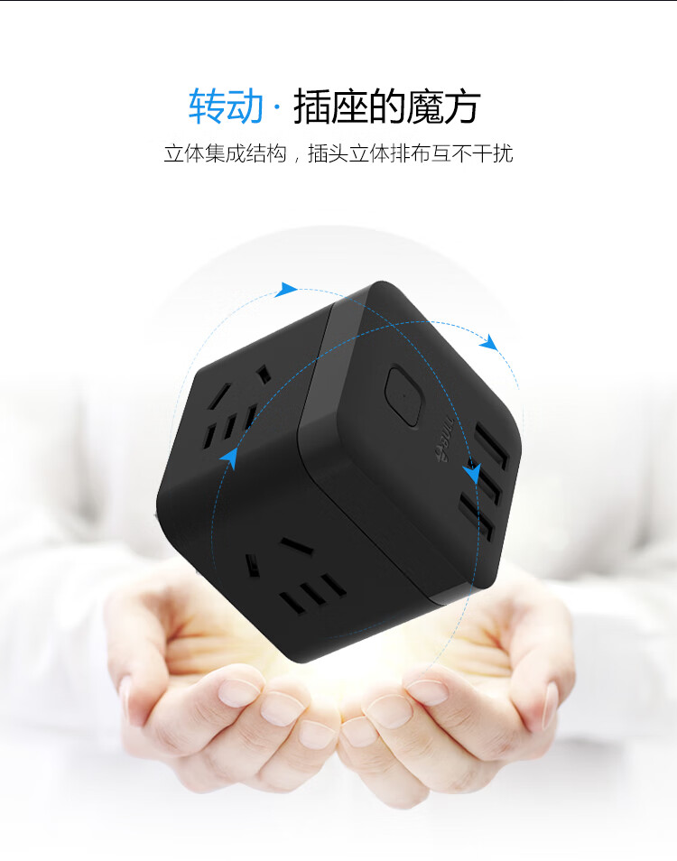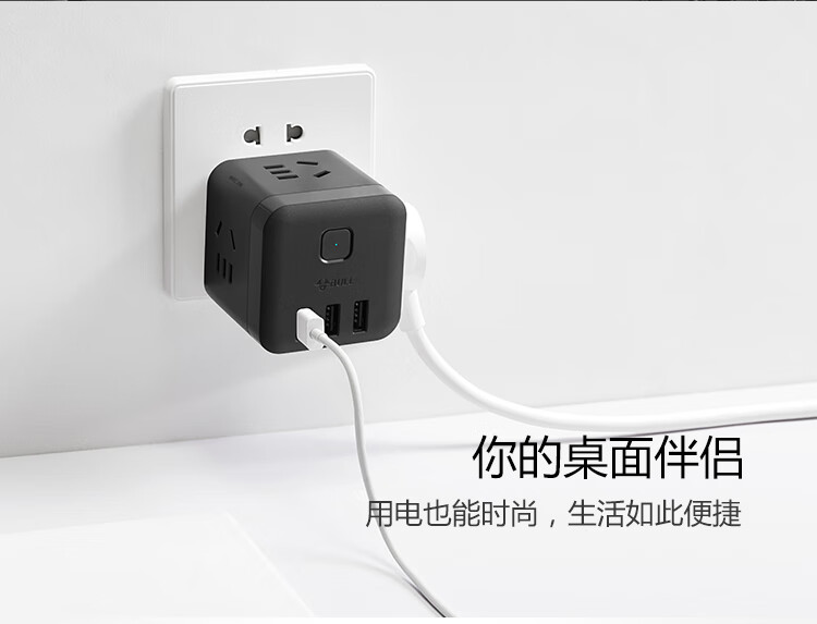 立体魔方设计,集成3个5扁孔插座与3个USB-A接口,实现多设备同时充电,空间利用率高