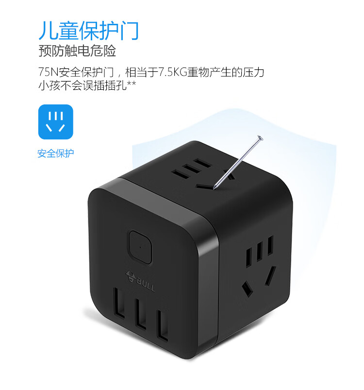 配备儿童安全保护门,75N压力触发机制有效防止儿童误触插孔,提升家庭使用安全性
