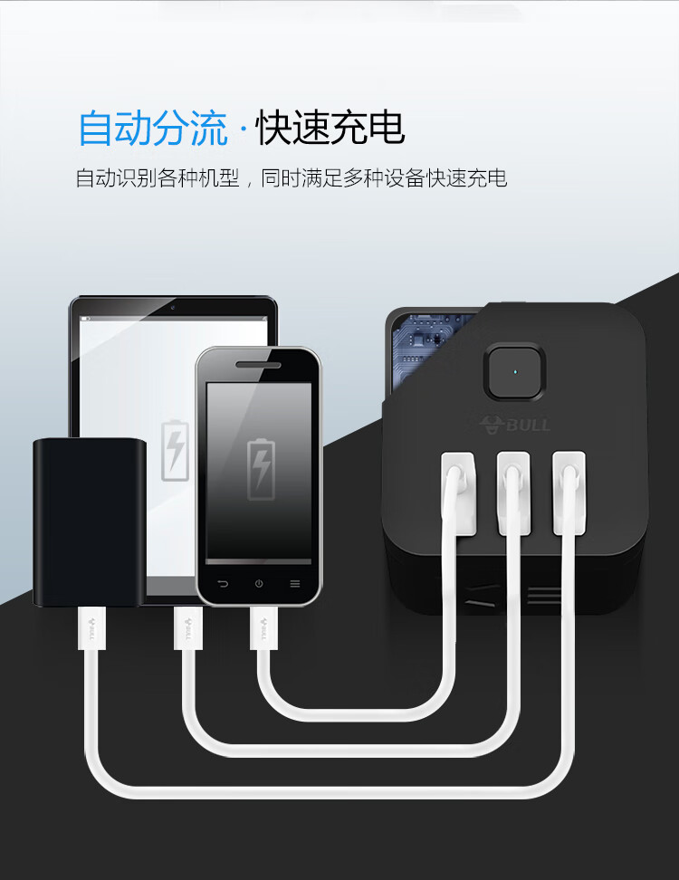 支持自动分流技术,智能识别连接设备类型,为手机、平板、耳机等提供最优充电电流(5V/3.1A),实现快速充电