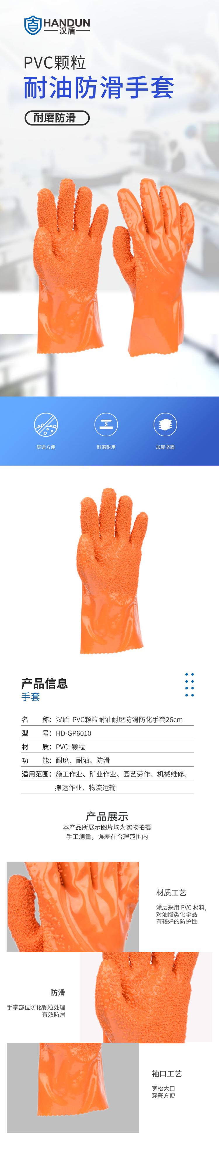 汉盾 HD-GP6010 PVC颗粒耐油耐磨防滑防化手套具有以下特点: