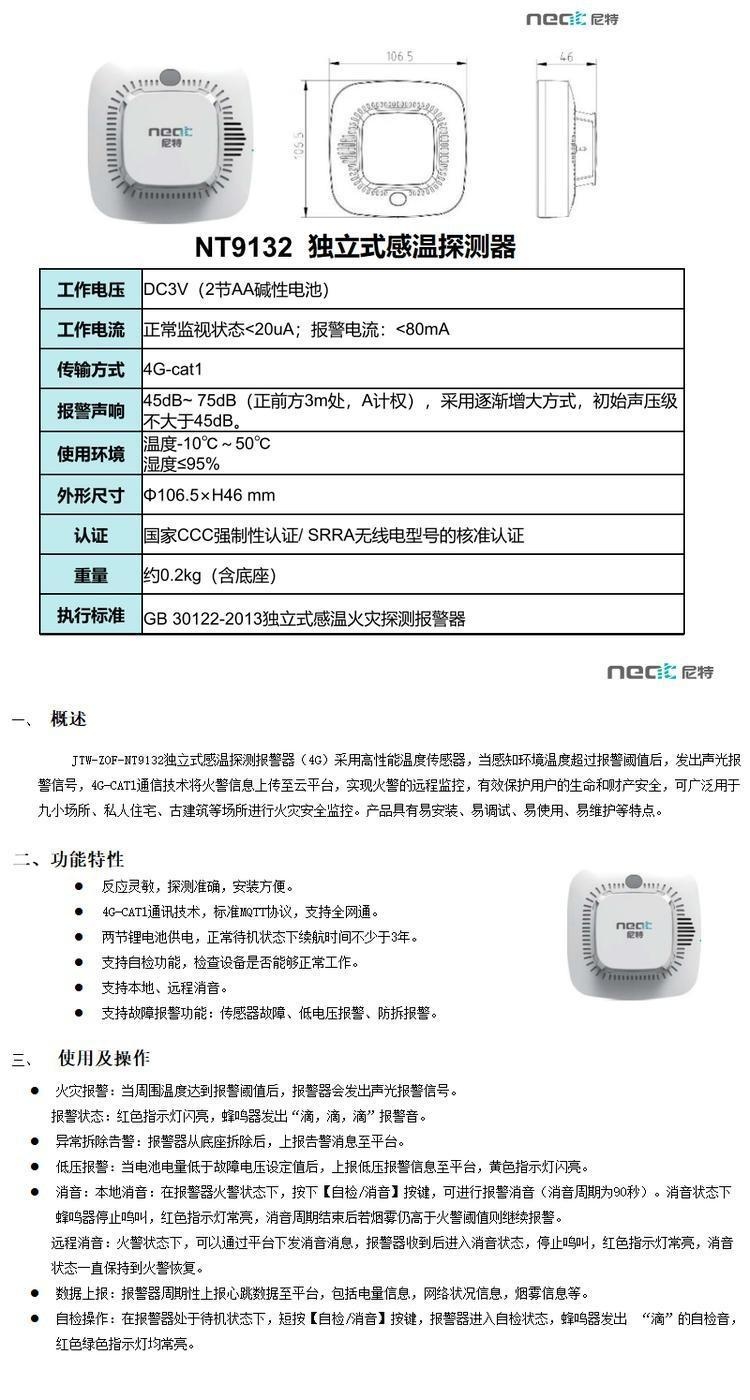 尼特JTW-ZOF-NT9132独立式感温火灾探测报警器采用高性能温度传感器,能够灵敏感知环境温度变化,当温度超过预设报警阈值时,立即发出声光报警信号,有效提升火灾早期预警能力。