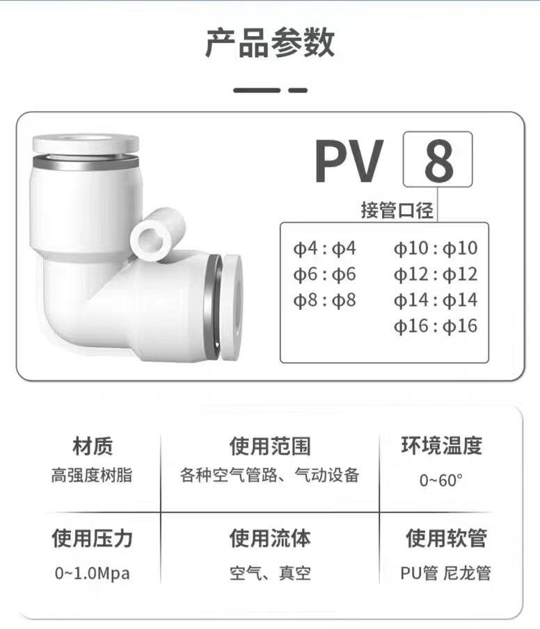 请根据实际使用的软管外径选择对应型号的接头,例如本款PV6适用于外径6mm的PU管或尼龙管。