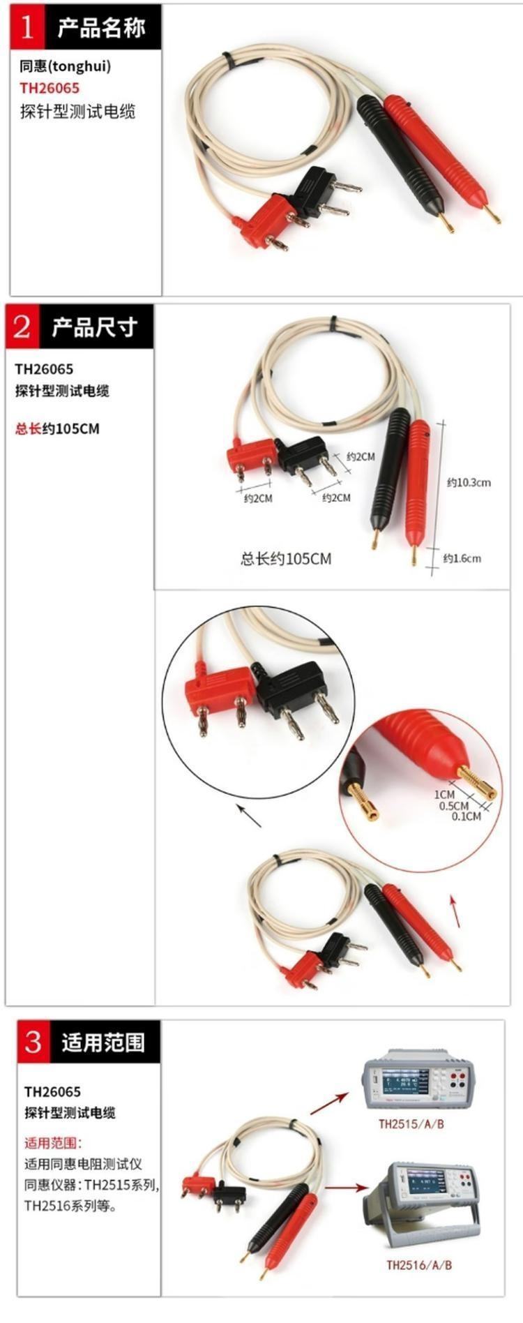 使用前请确认测试电缆与所连接的仪器型号兼容,仅适用于同惠TH2515系列及TH2516系列设备。