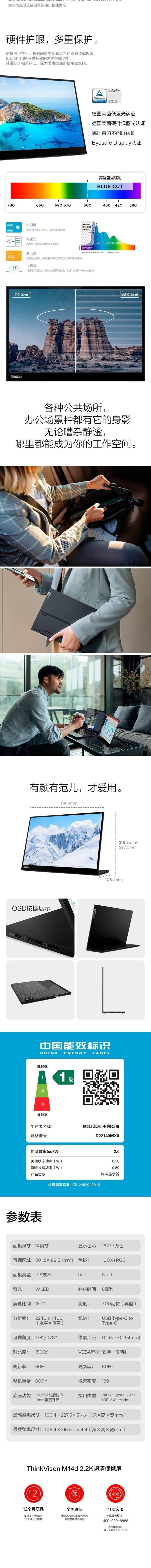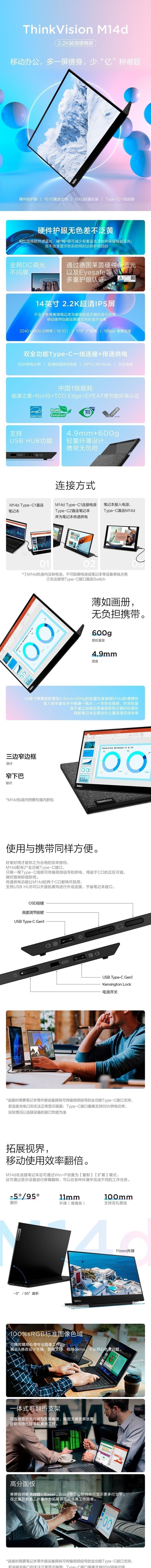 联想ThinkVision M14d是一款专为移动办公设计的14英寸便携显示器,采用2.2K超清IPS面板,分辨率为2240×1400(16:10),支持100%sRGB色域,能够呈现细腻且色彩准确的画面。其配备全局DC调光技术,有效减少屏幕闪烁,结合德国莱茵低蓝光认证和Eyesafe Display认证,实现硬件级护眼功能,减轻长时间使用带来的视觉疲劳。显示器厚度仅为4.9mm,整机重量仅600g,轻薄便携,适合随身携带。支持双全功能Type-C接口,可实现视频传输、数据传输及最高65W反向供电,满足笔记本扩展与充电需求。同时具备USB HUB功能,扩展连接能力。机身采用三边窄边框设计,搭配可调节的一体式支架,支持-5°至95°翻转、11mm升降以及100mm双孔壁挂,适应多种使用场景。通过中国能效一级认证,节能高效,符合RoHS、TCO Edge等环保标准。