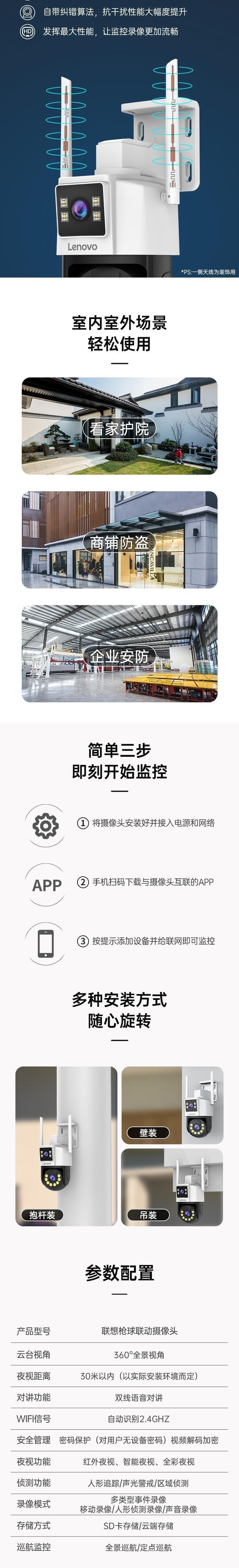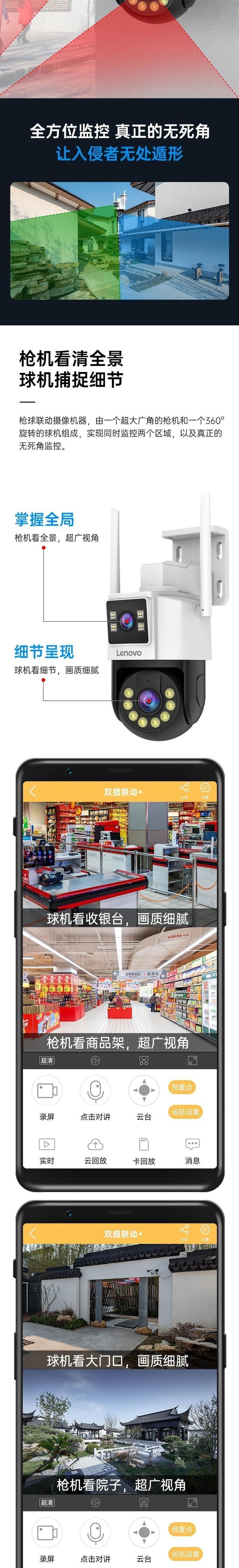 双镜头双画面:枪机镜头负责全景监控,提供超广视角;球机镜头则用于细节捕捉,画质细腻清晰,兼顾全局与局部。