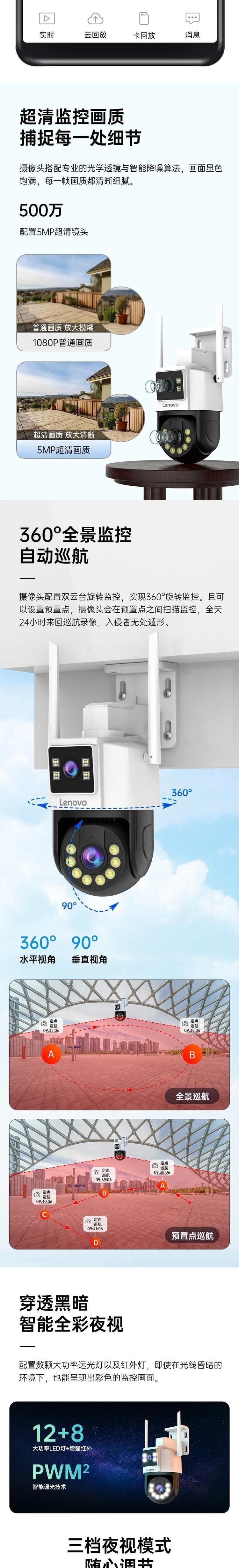 联想智能摄像头X6T采用双镜头联动设计,配备一个超大广角枪机镜头和一个360°旋转球机镜头,实现双画面同时监控,彻底解决传统单镜头摄像机的视野盲区问题。